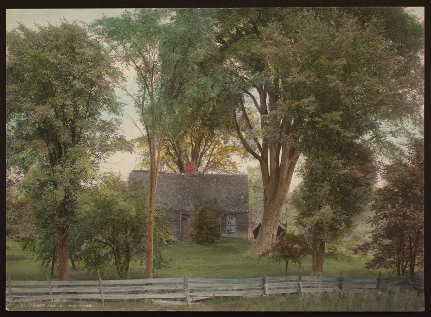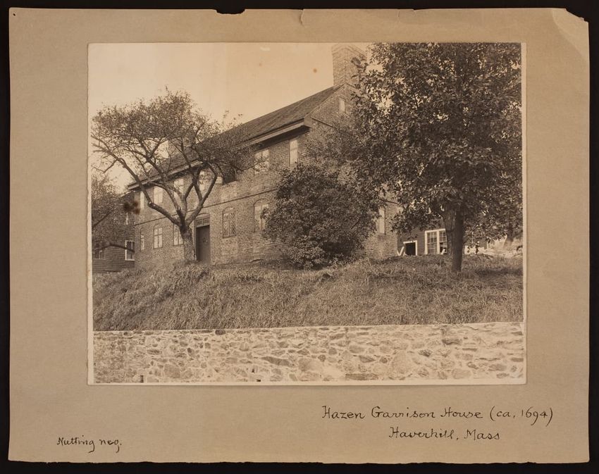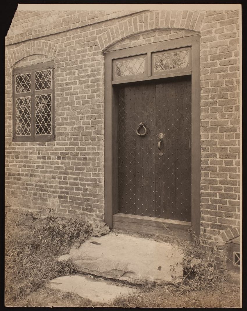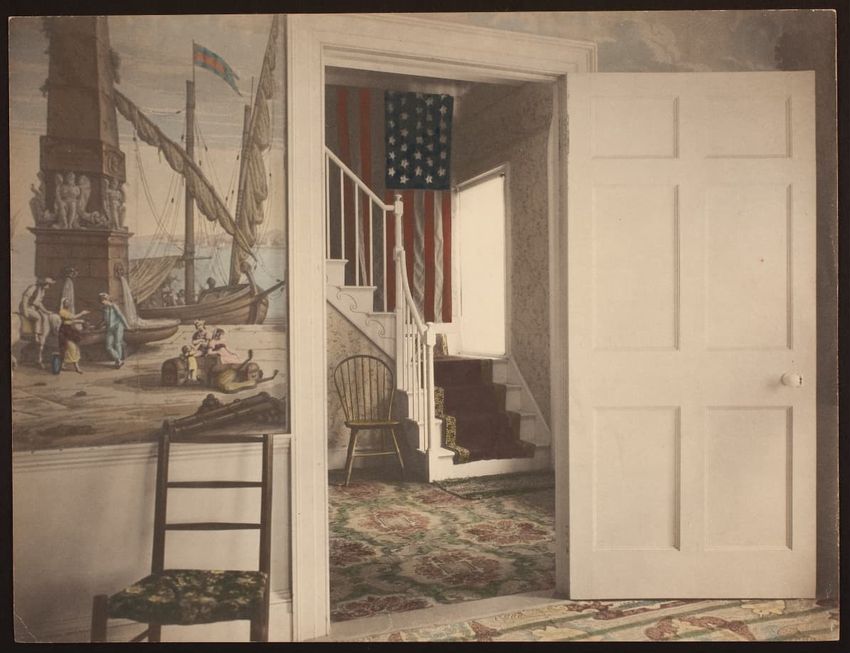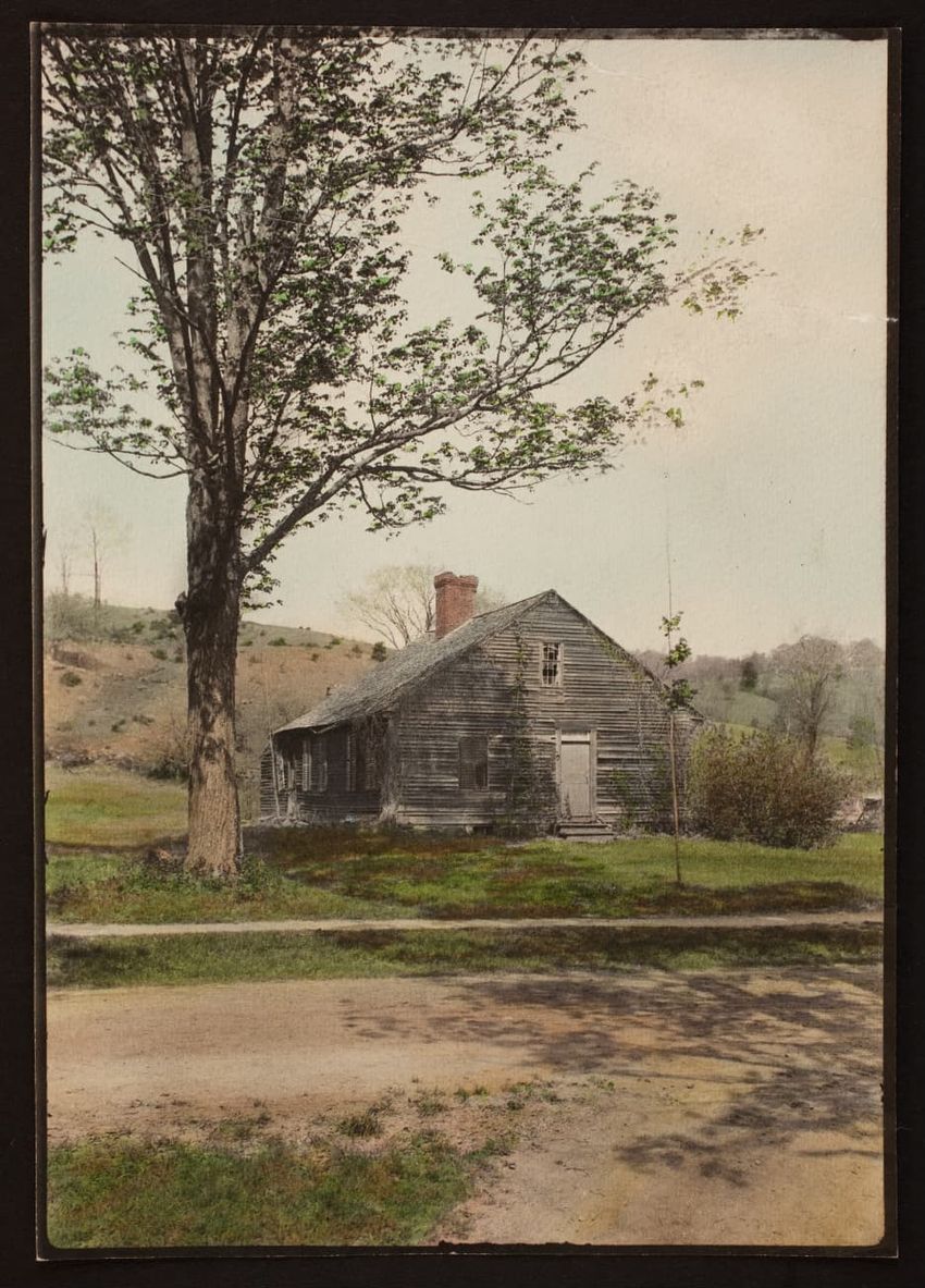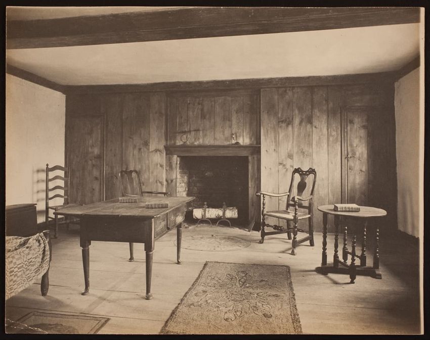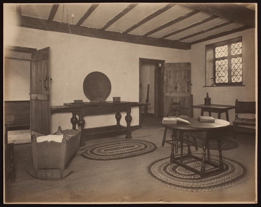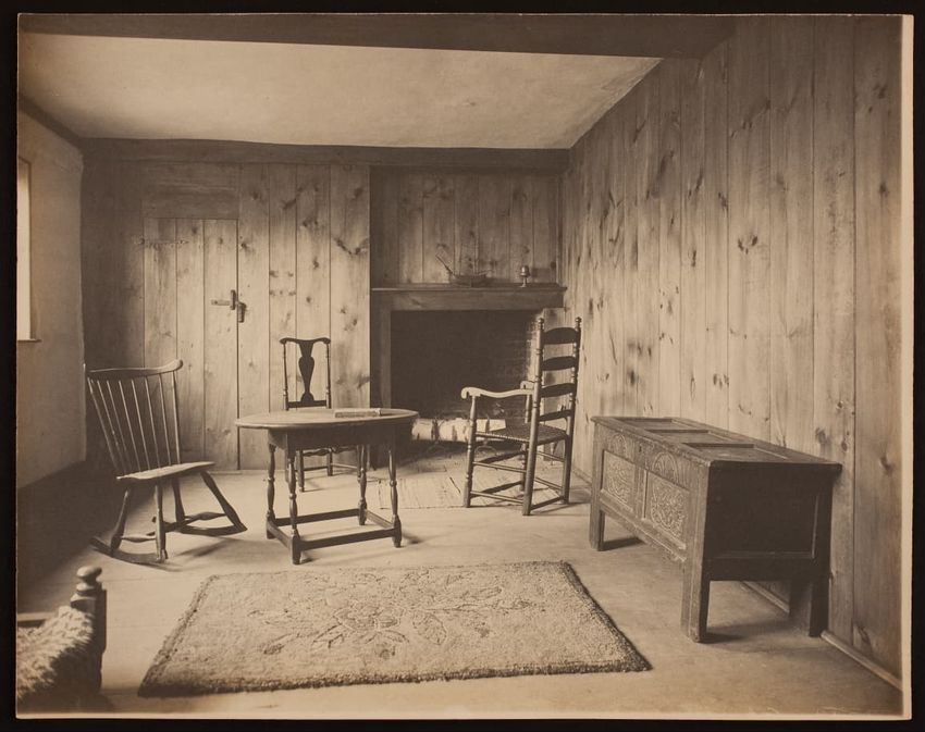 This interior view of the east wall of the west parlor or kitchen in the Hazen Garrison house, Haverhill, Massachusetts, shows two open doors, tables, chairs and a cradle.