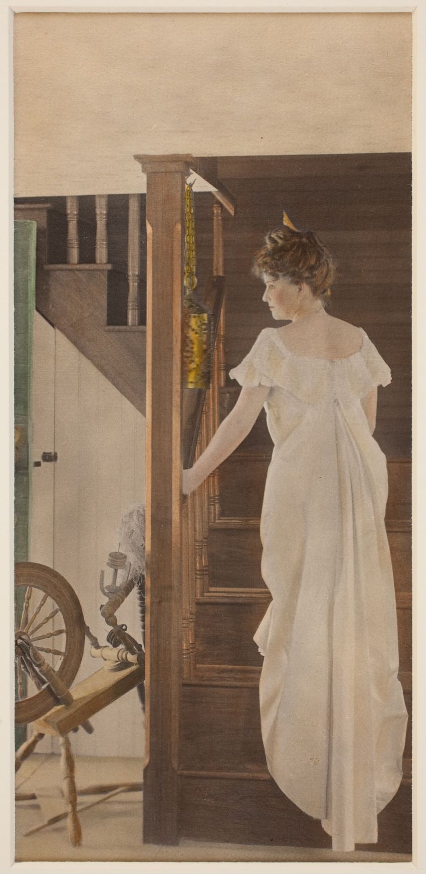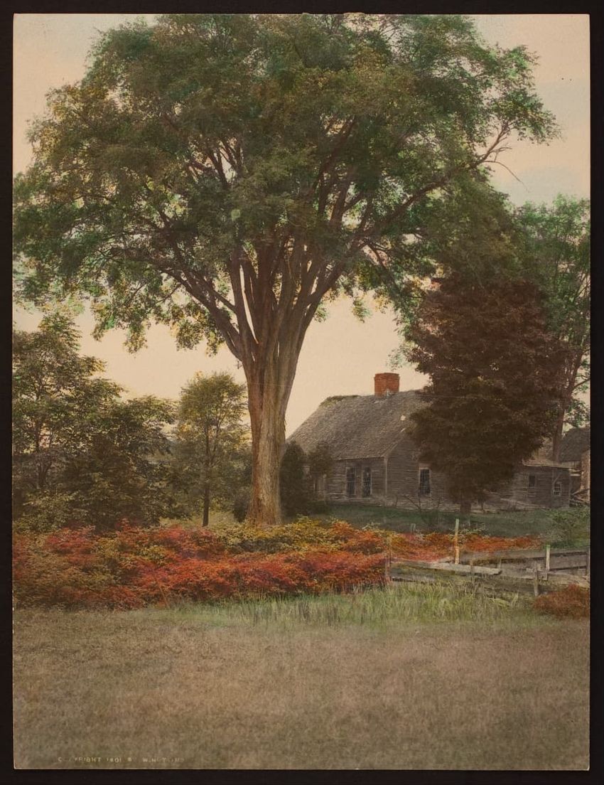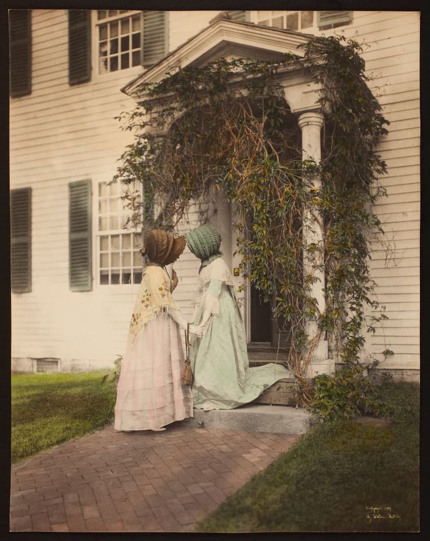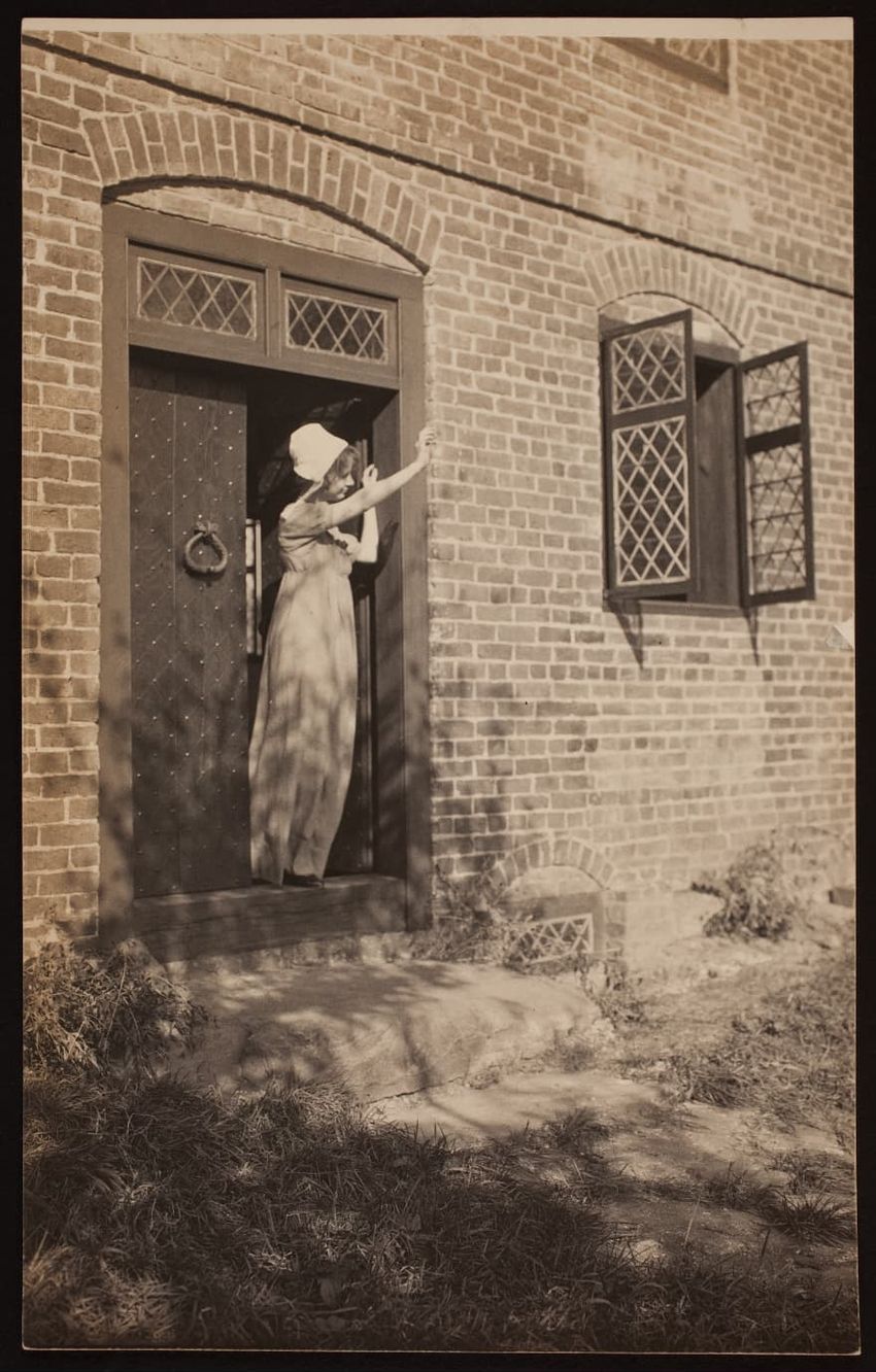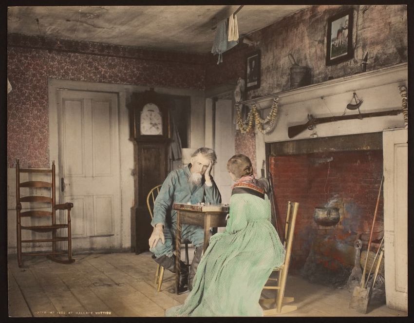 This interior view of the east wall of the west parlor or kitchen in the Hazen Garrison house, Haverhill, Massachusetts, shows two open doors, tables, chairs and a cradle.