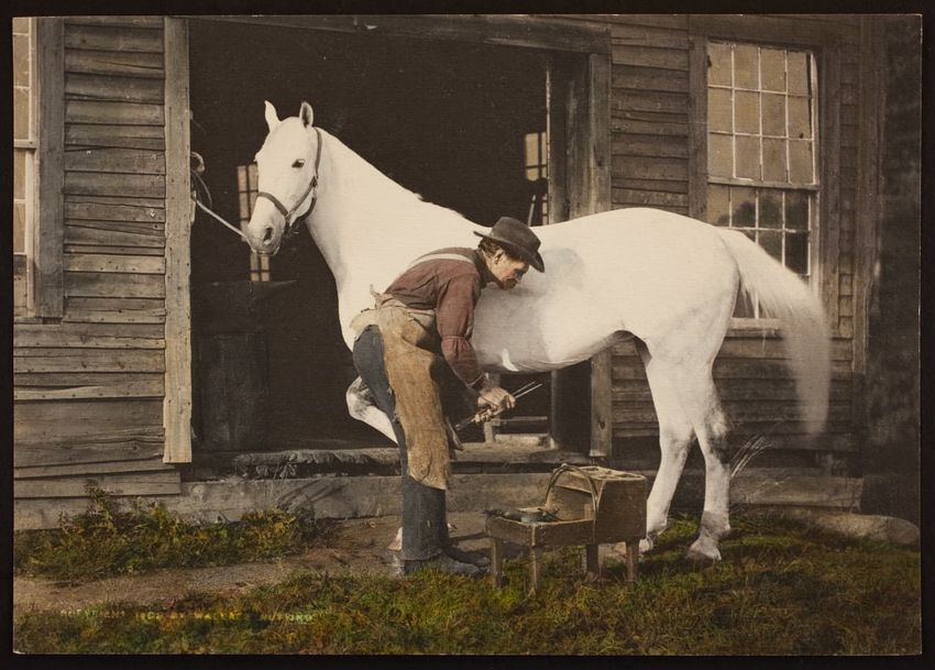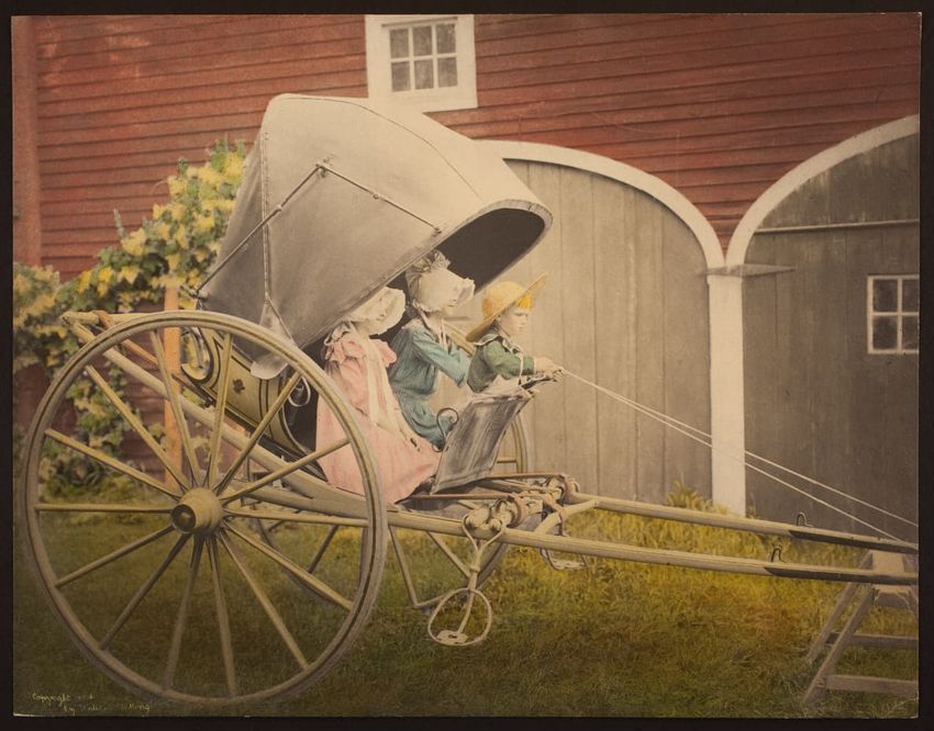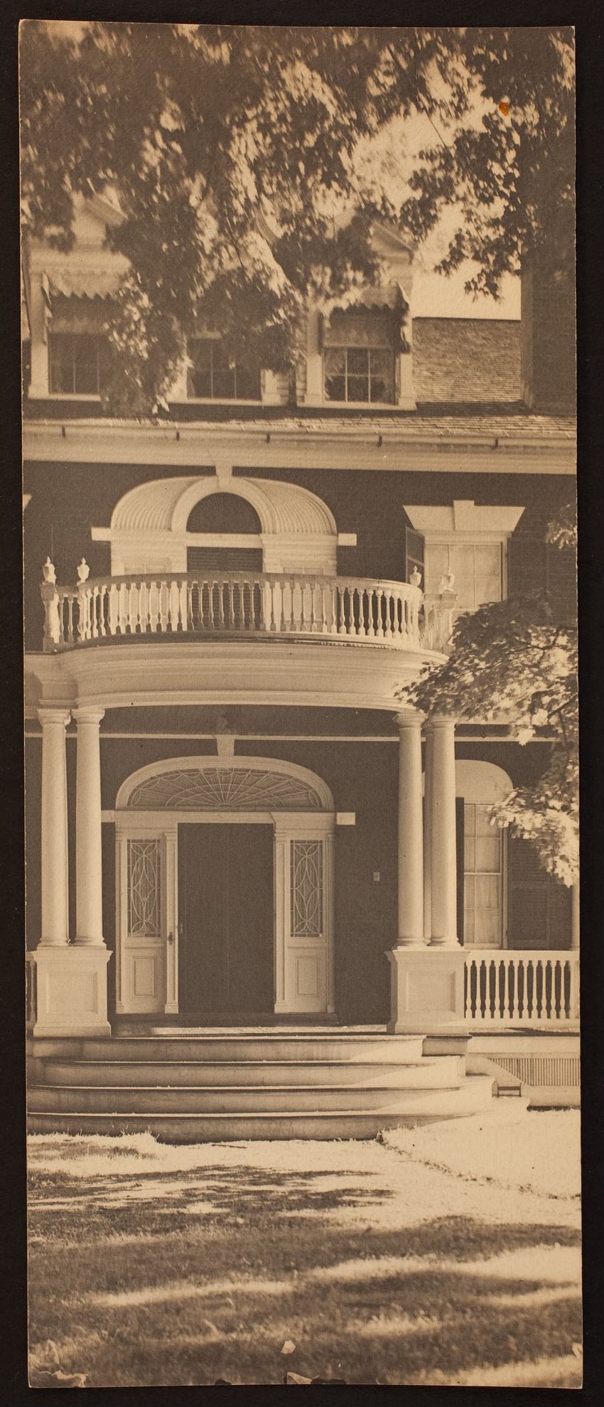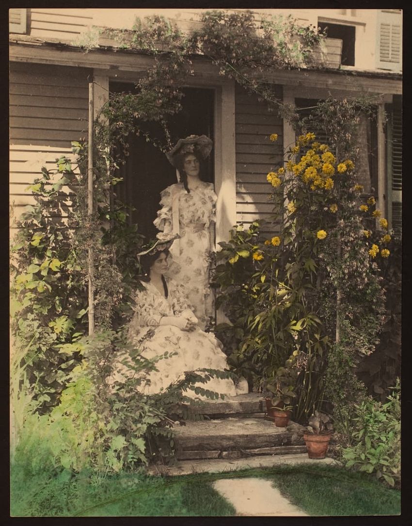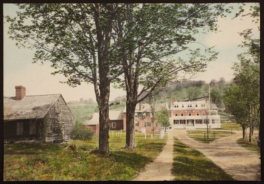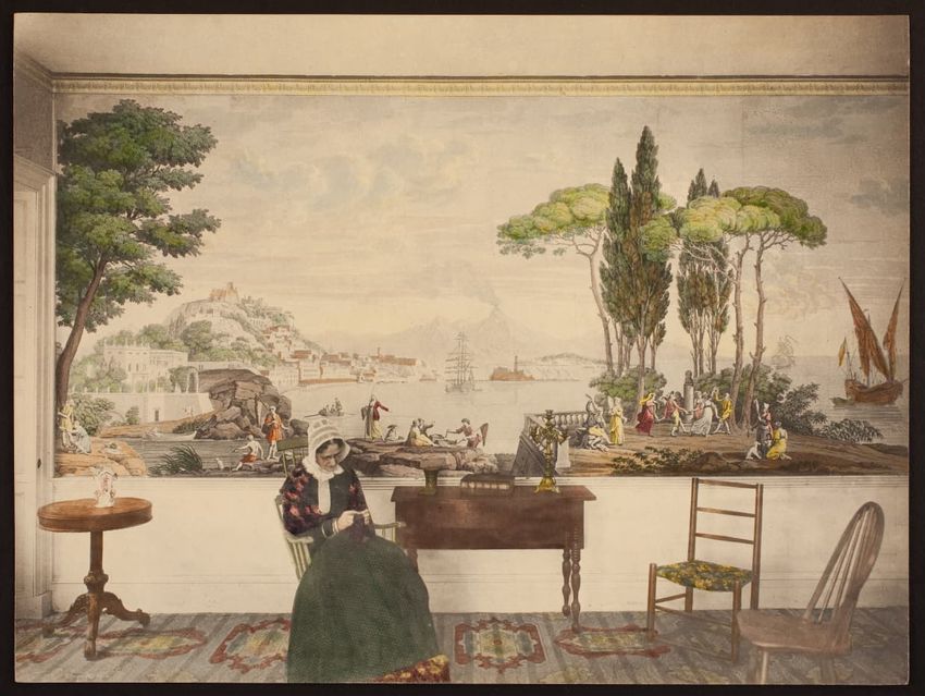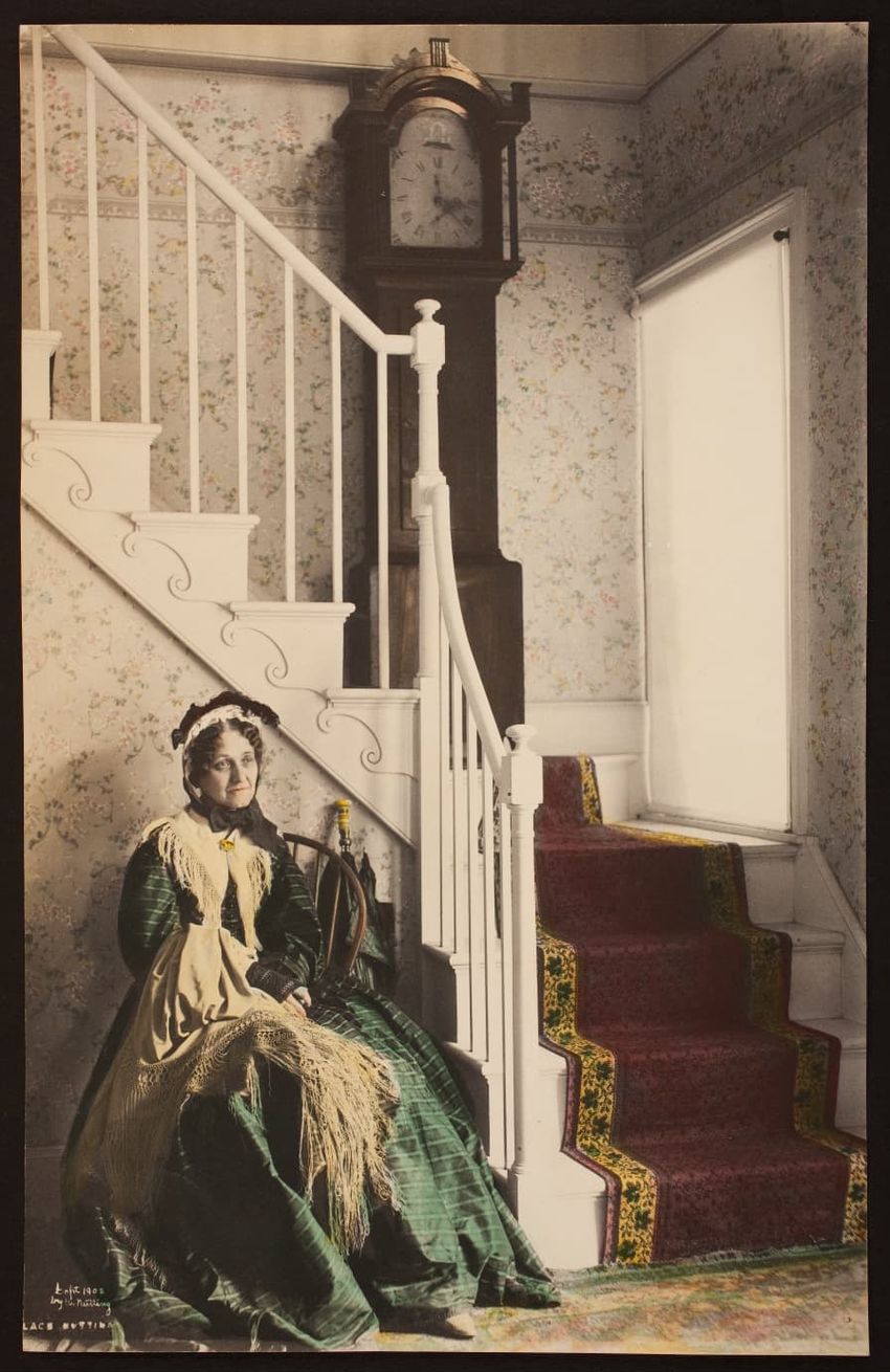 This interior view of the east wall of the west parlor or kitchen in the Hazen Garrison house, Haverhill, Massachusetts, shows two open doors, tables, chairs and a cradle.