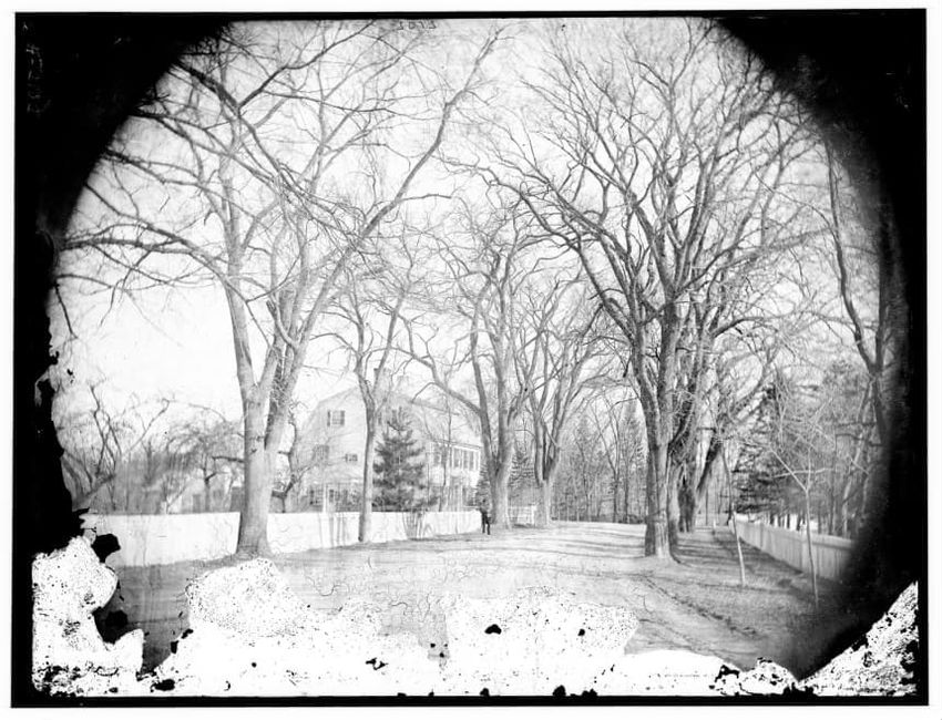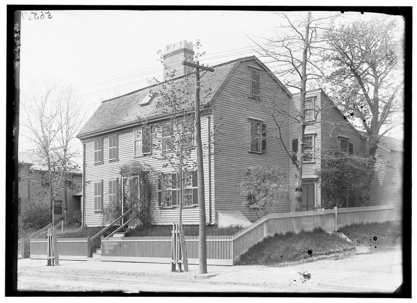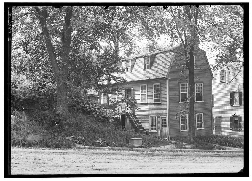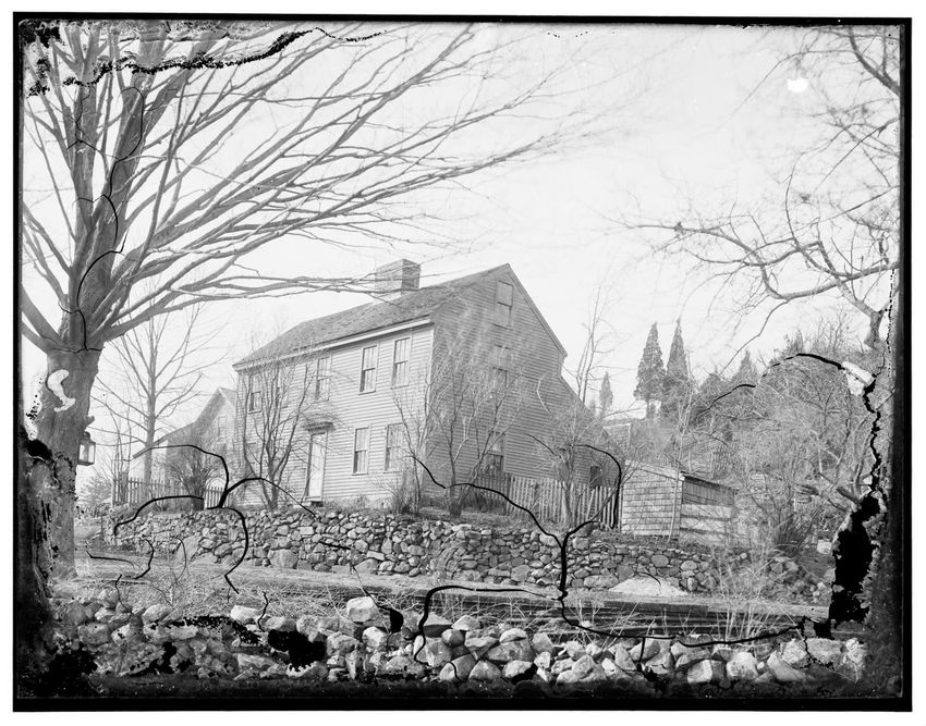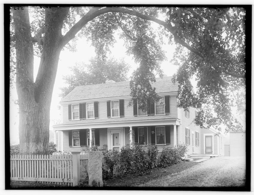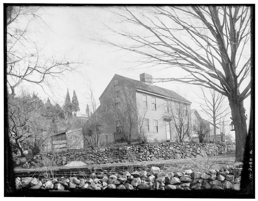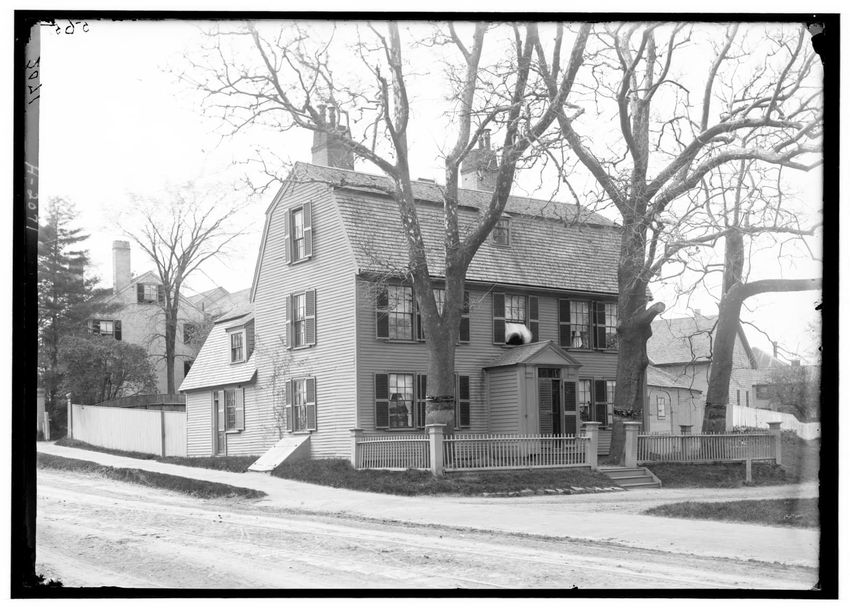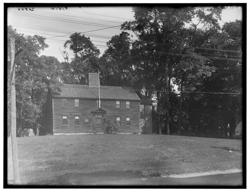 The image depicts Houghton House in Milton, Massachusetts. It is a two-story, timber-framed house with a gabled roof. The facade features symmetrically arranged windows with shutters and curtains, and a prominent central chimney. In the foreground, there are trees and a lamp post near a curved drive...