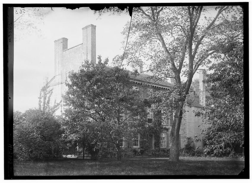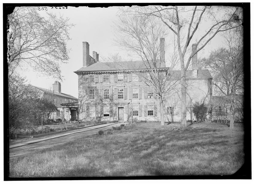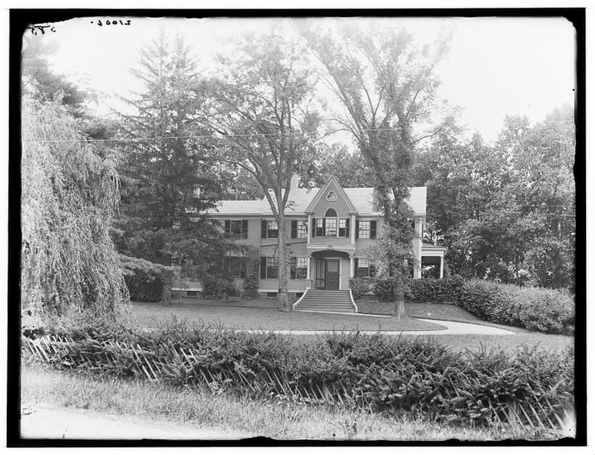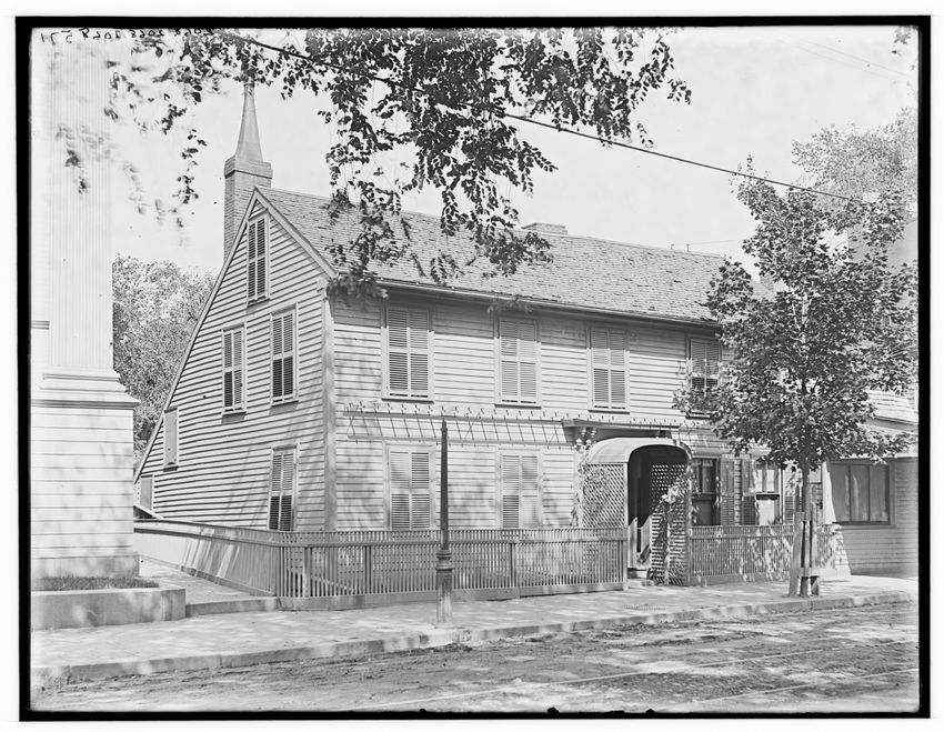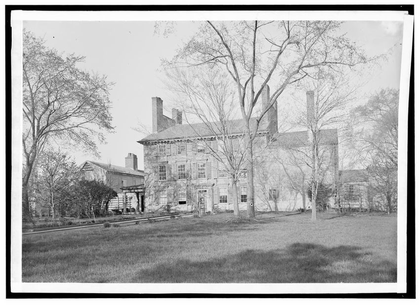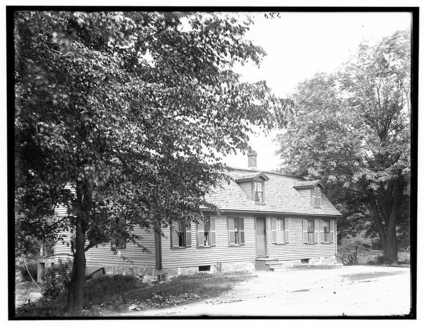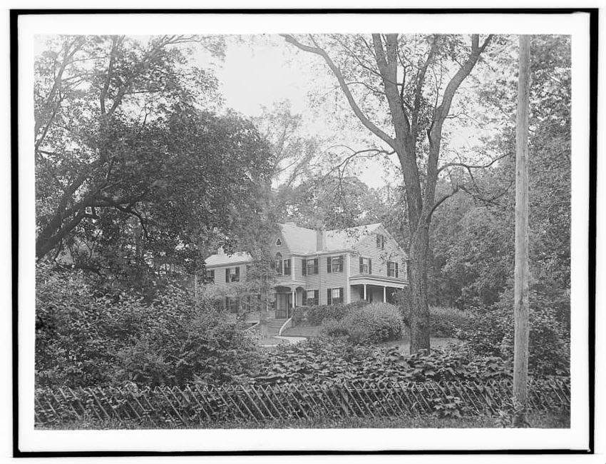 The image depicts Houghton House in Milton, Massachusetts. It is a two-story, timber-framed house with a gabled roof. The facade features symmetrically arranged windows with shutters and curtains, and a prominent central chimney. In the foreground, there are trees and a lamp post near a curved drive...