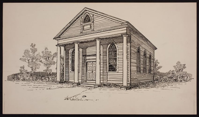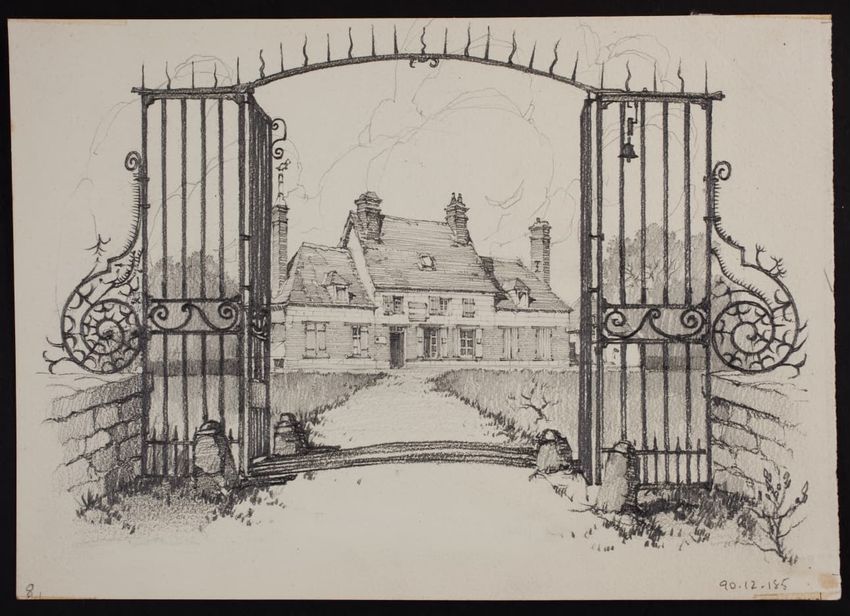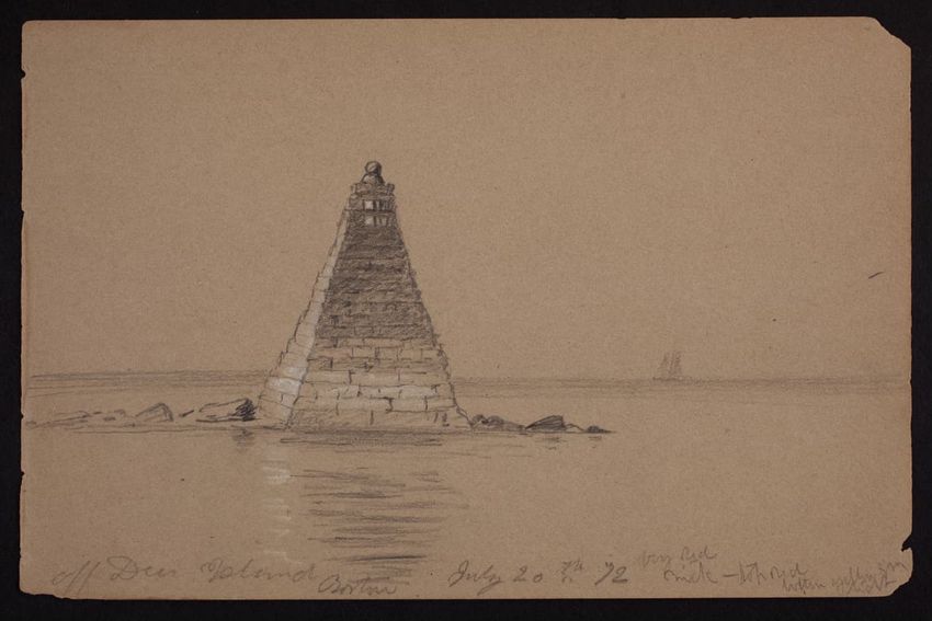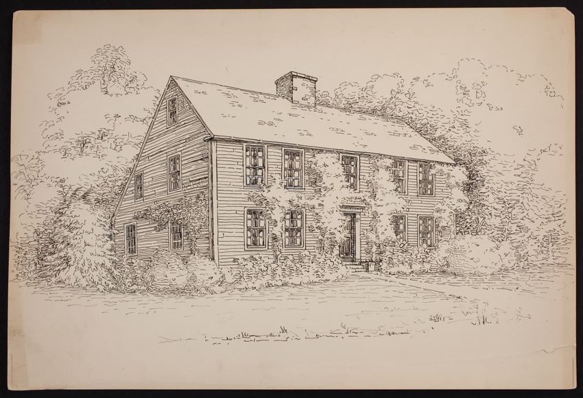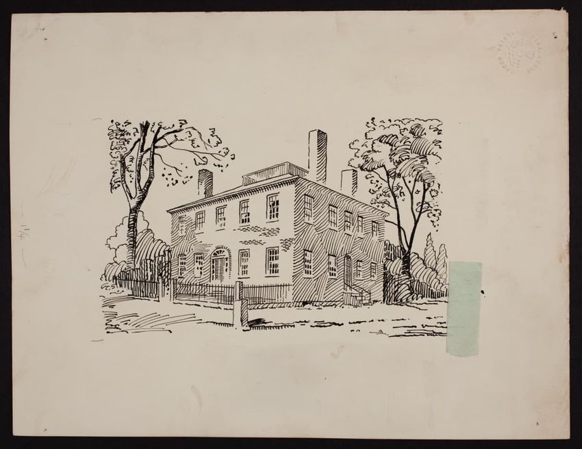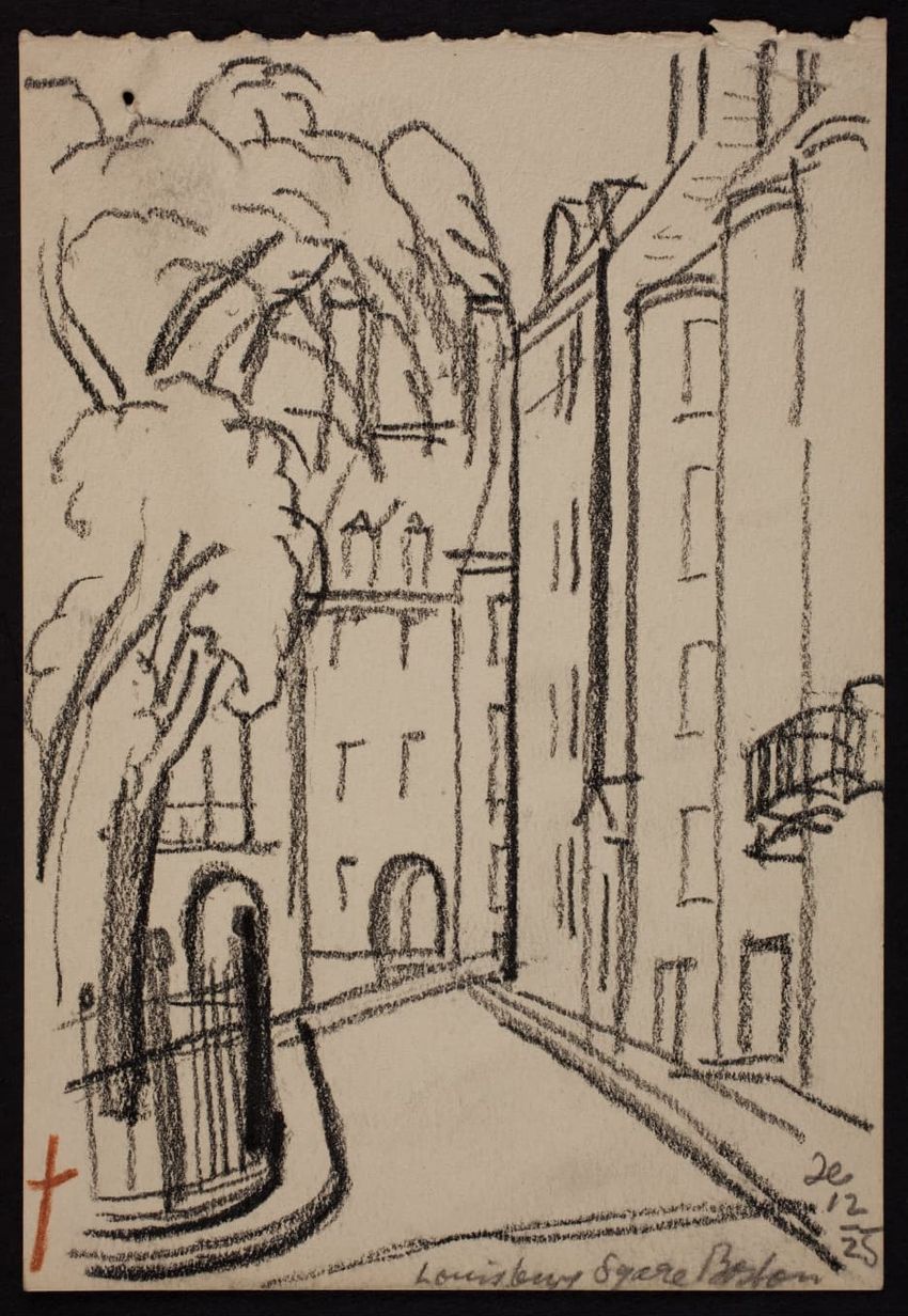 The crayon drawing by an unknown artist shows Louisburg Square in Boston, Massachusetts.