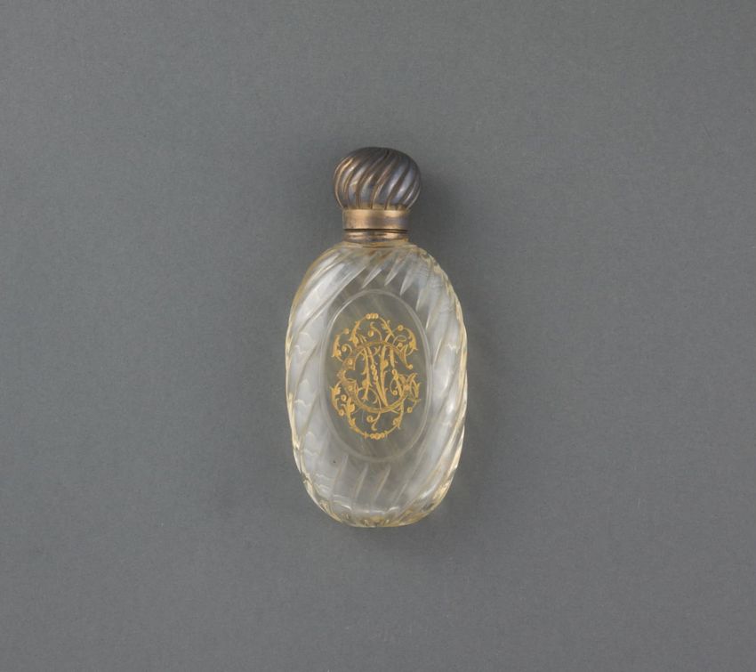 FAN (A): Abalone sticks and guards; one side of leaf is bright pink satin painted with white flowers and green leaves; reverse is white satin painted with initials A.V.L. in garlands of small white flowers; rhinestone-set rivet; curved [carved?] metal ring. BOX (B): Hinged cardboard covered in ta...