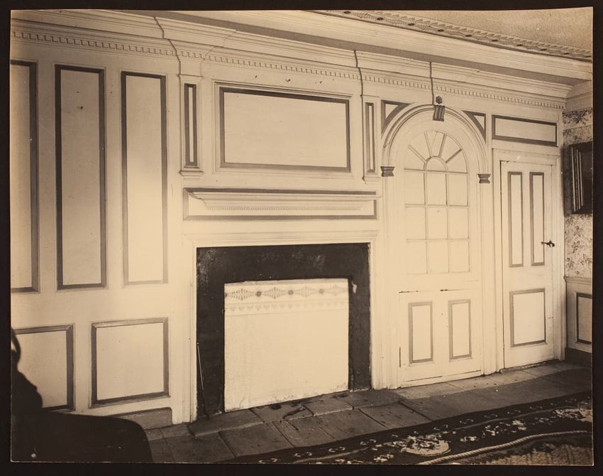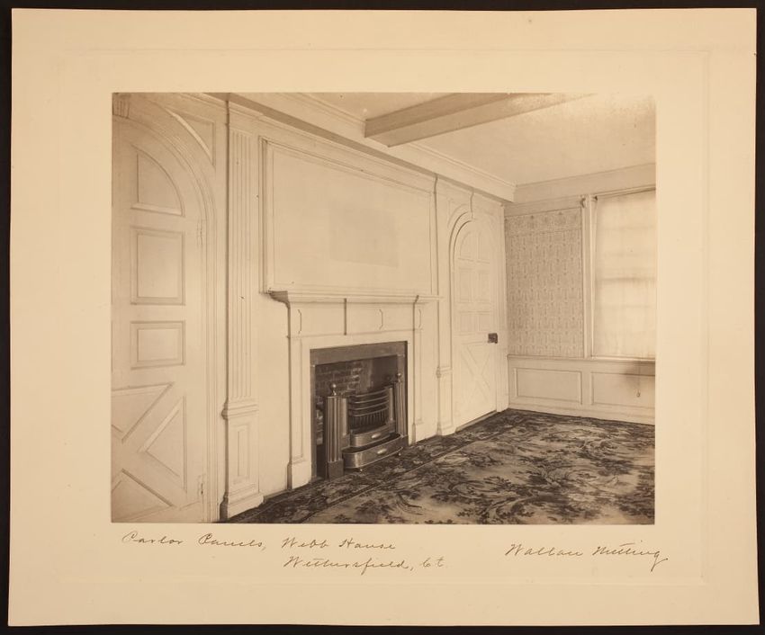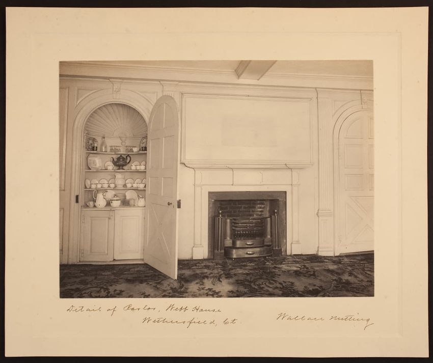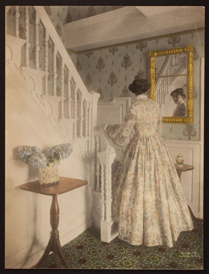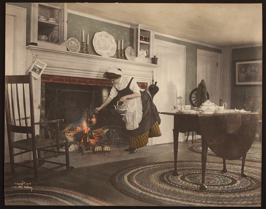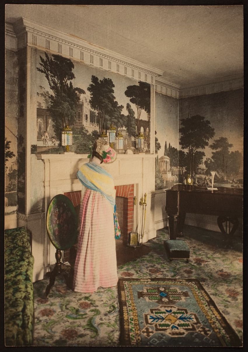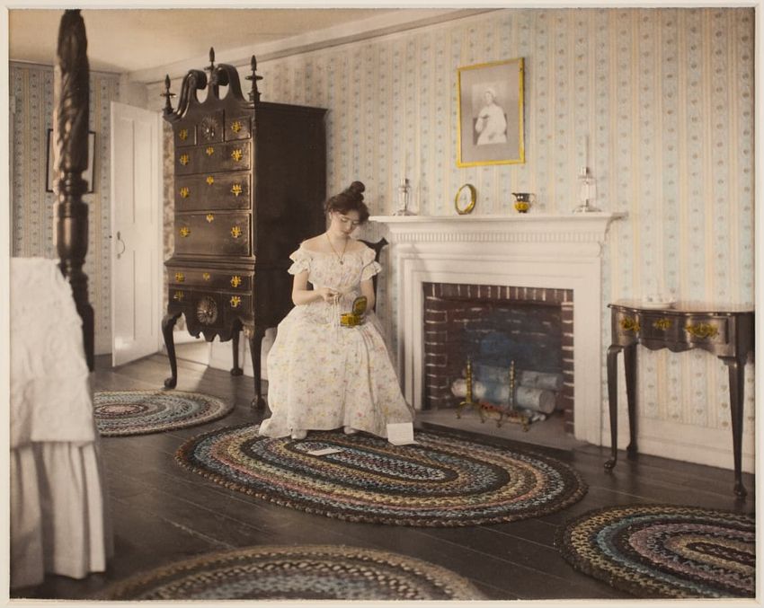 A female model, in period costume, examines a jewel box while sitting next to a bedroom fireplace at Nutting's house, Southbury, Connecticut.