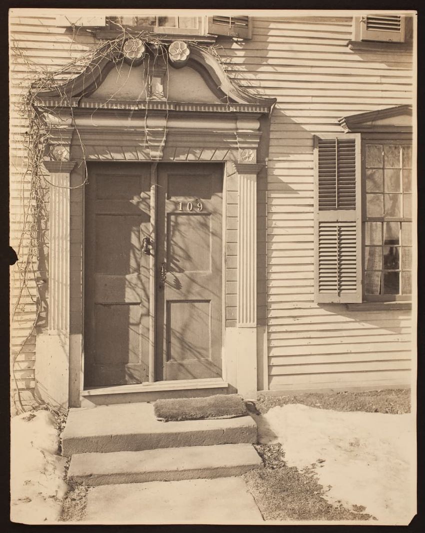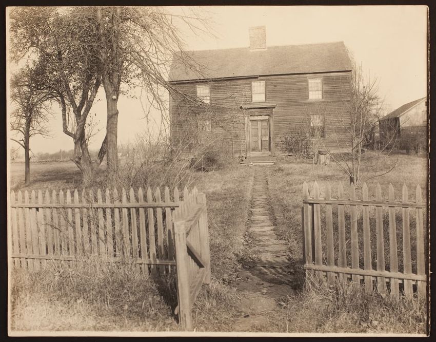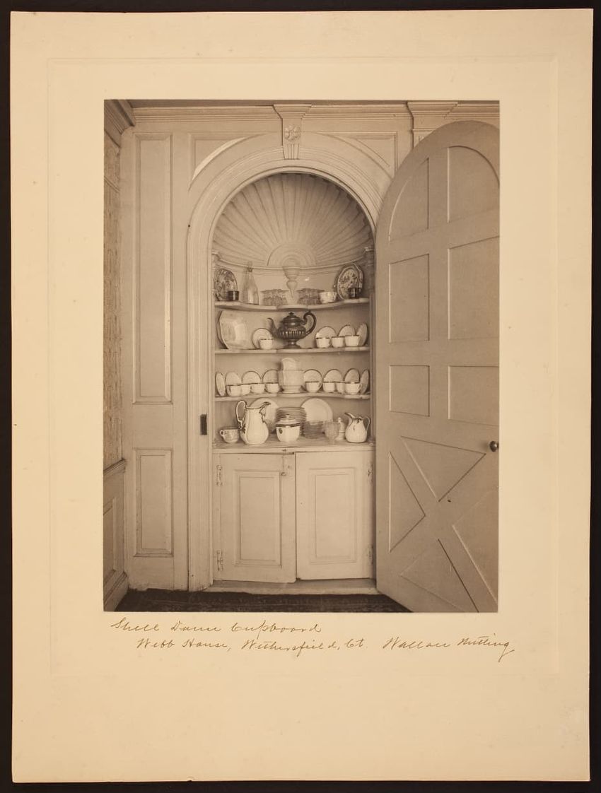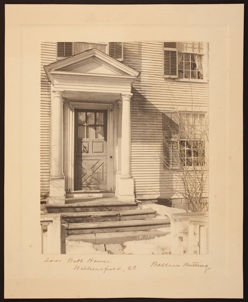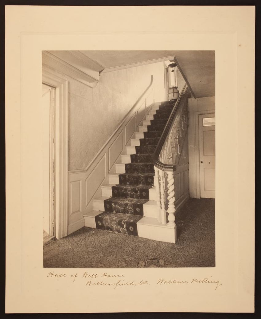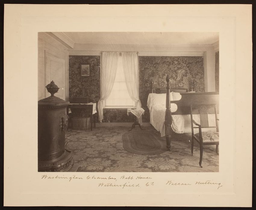 A female model, in period costume, examines a jewel box while sitting next to a bedroom fireplace at Nutting's house, Southbury, Connecticut.
