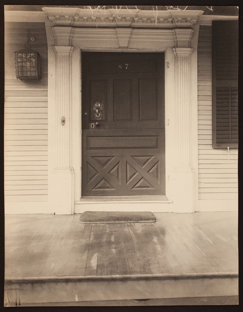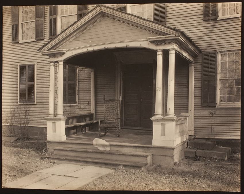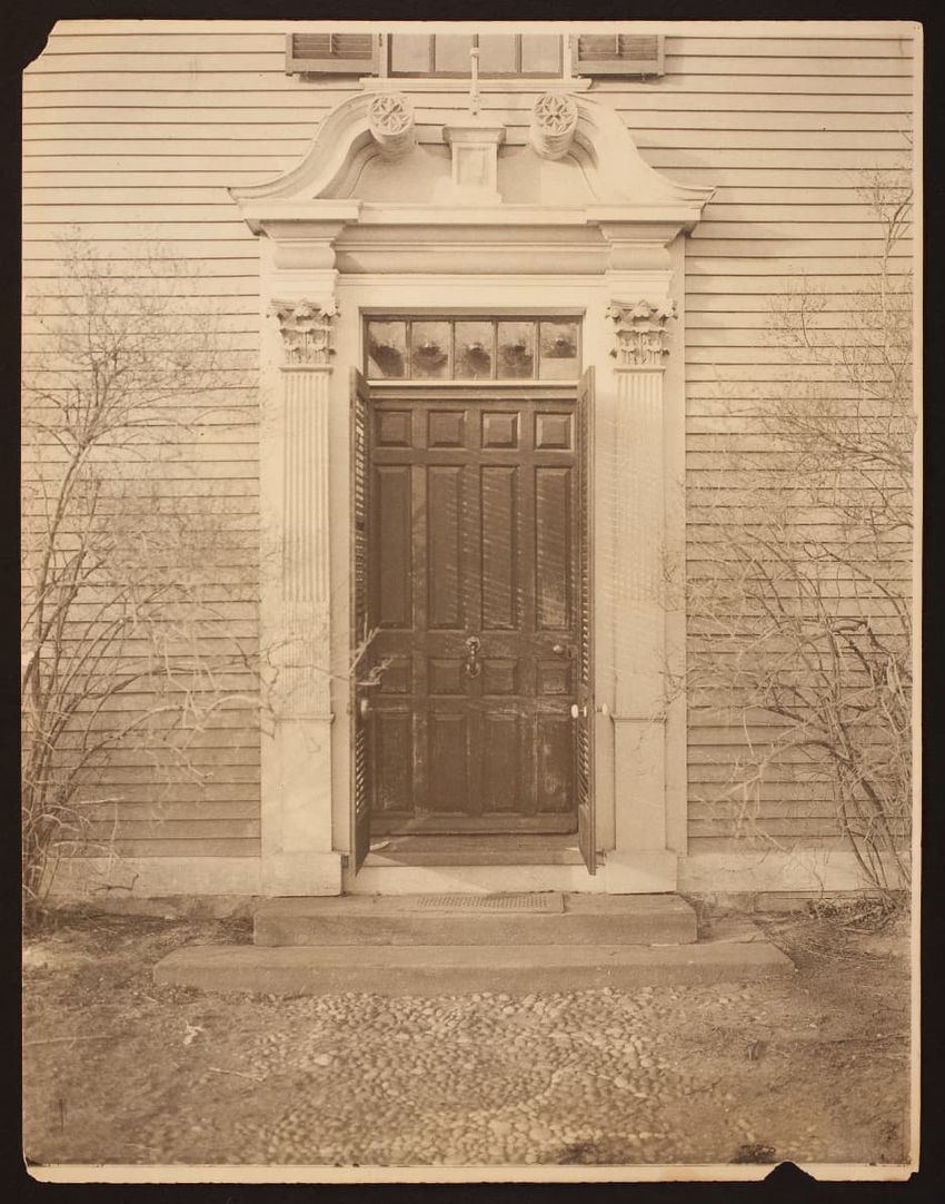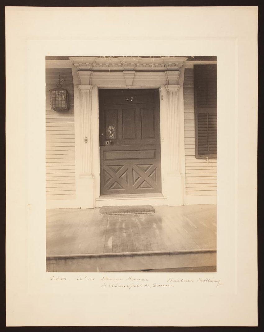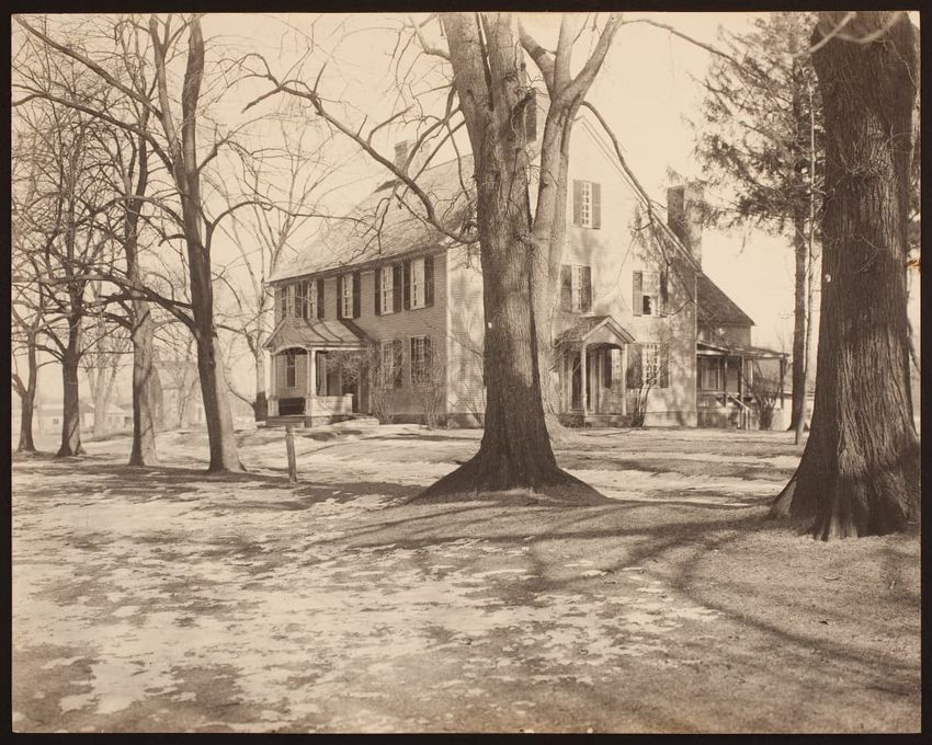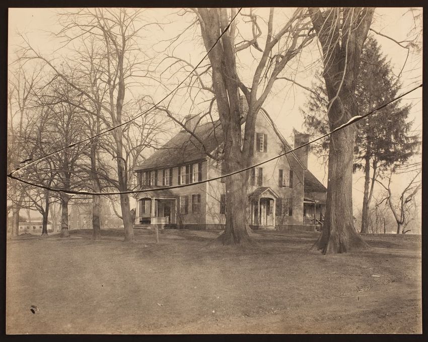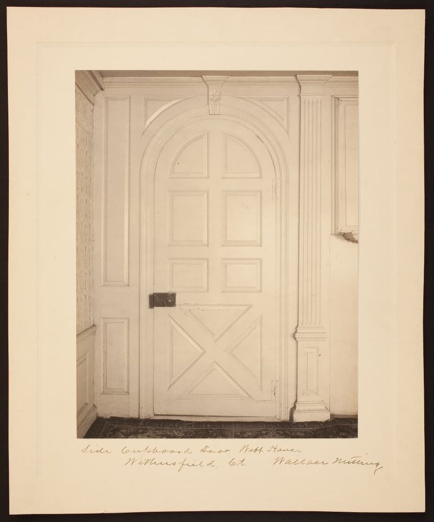 A female model, in period costume, examines a jewel box while sitting next to a bedroom fireplace at Nutting's house, Southbury, Connecticut.
