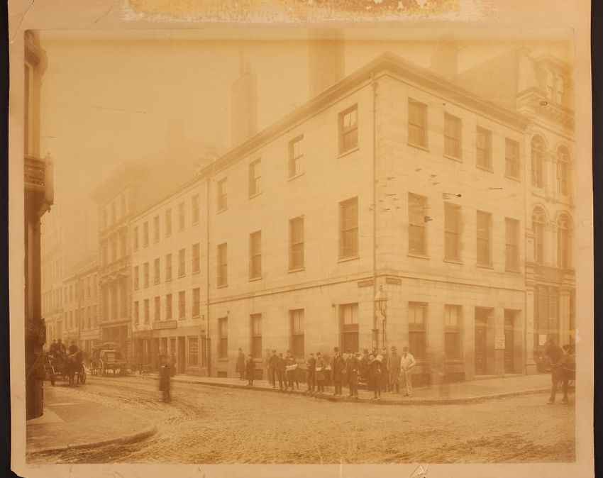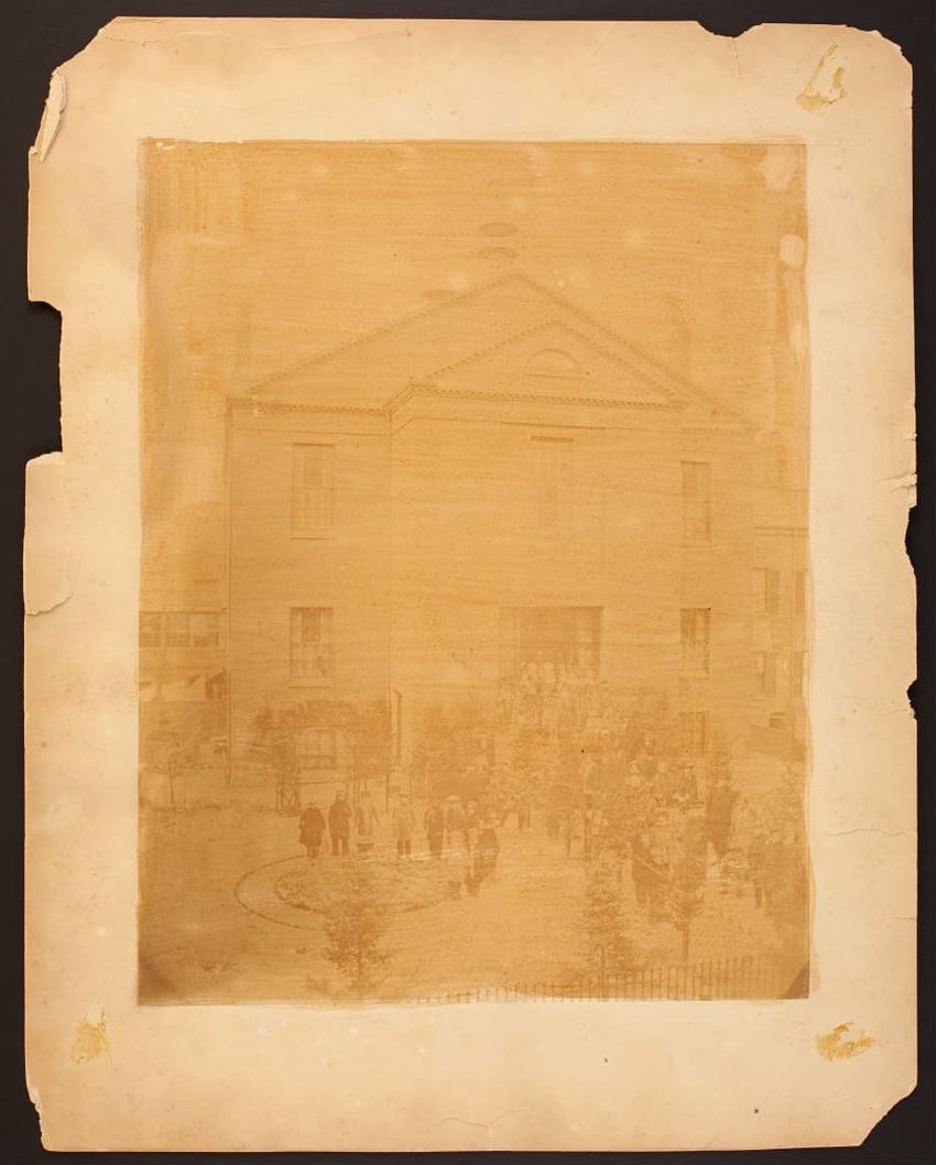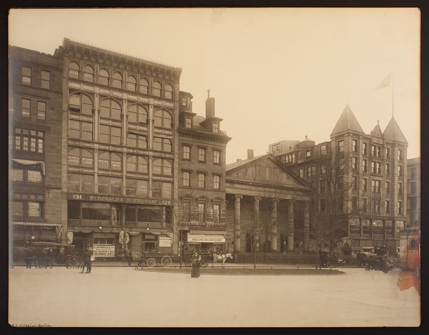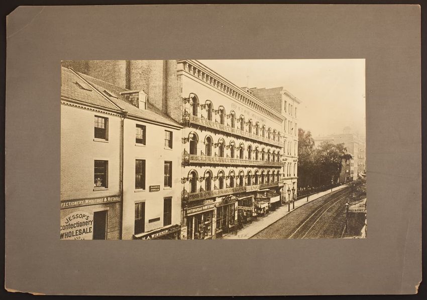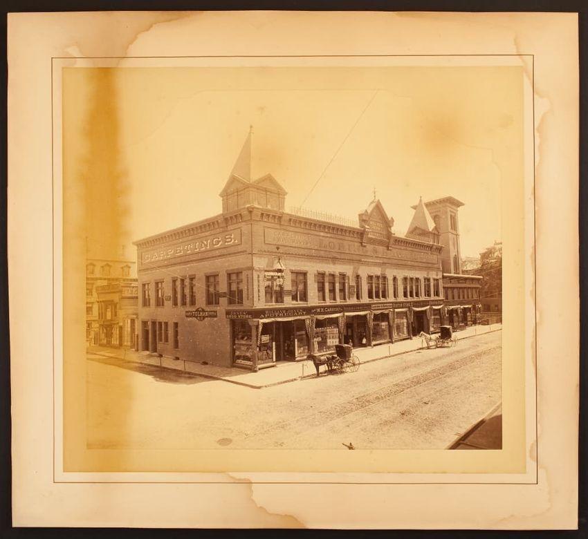 Informal group portrait of men and women, possibly patrons and proprietors, standing in front of Ferdinand & Co.'s Furniture and Carpet Store, 1872 Washington Street, corner of Washington and Warren Street. Merchandise, including stoves, tables and chairs, baby carriages, and rolls of carpet are on ...