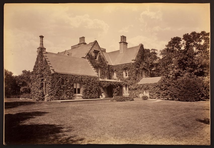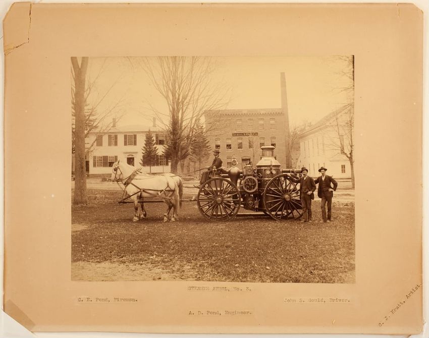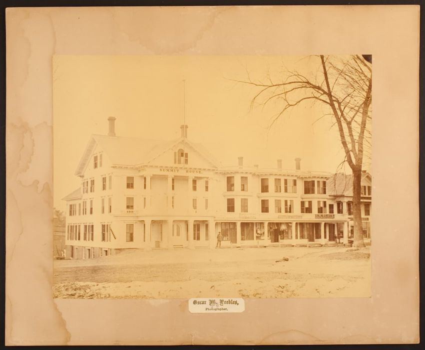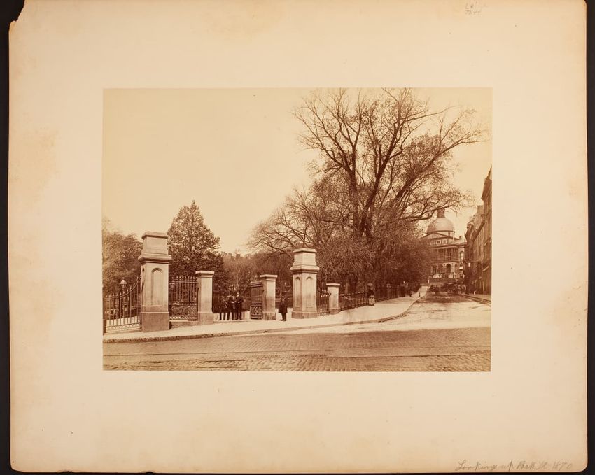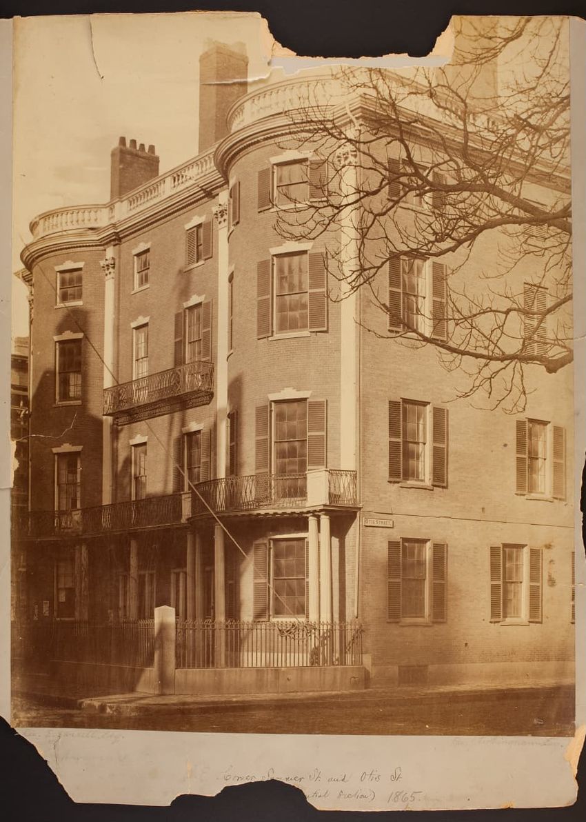 Informal group portrait of men and women, possibly patrons and proprietors, standing in front of Ferdinand & Co.'s Furniture and Carpet Store, 1872 Washington Street, corner of Washington and Warren Street. Merchandise, including stoves, tables and chairs, baby carriages, and rolls of carpet are on ...