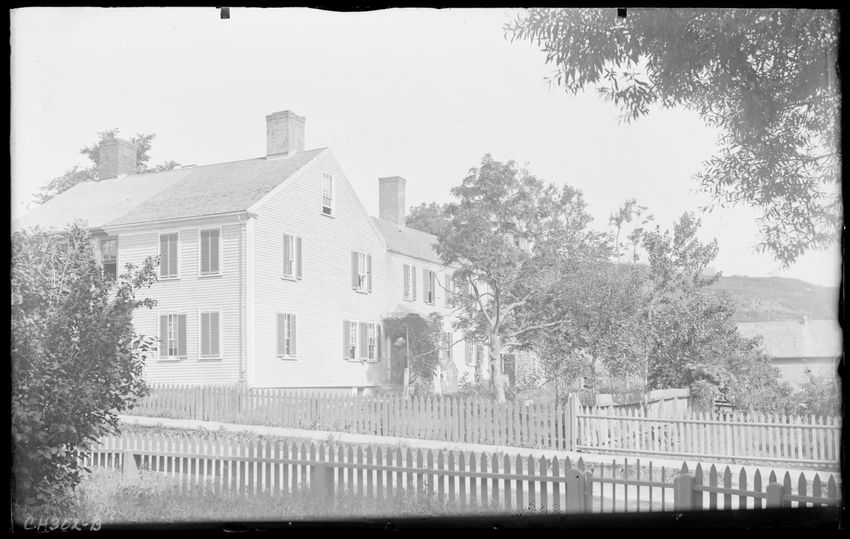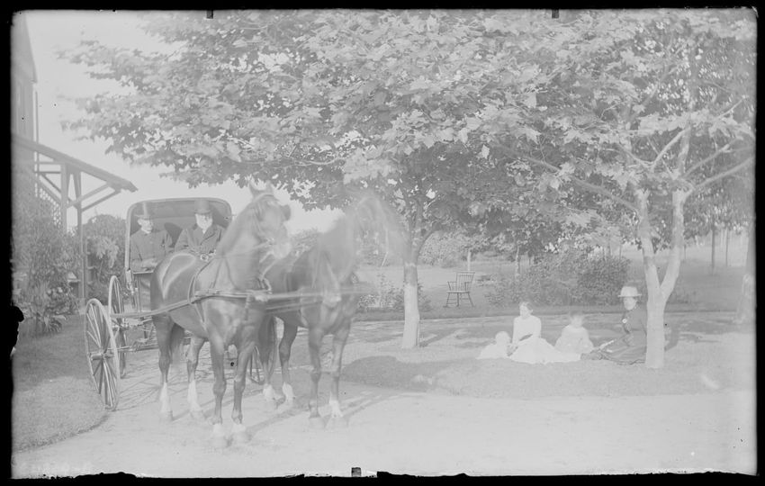 The image depicts a single-story frame house with a chimney, surrounded by grass and some bushes. There are three people visible near the house, along with a dog. A path leads up to the house from the foreground. To the left, a person is seated in a horse-drawn carriage, and an outbuilding is partia...