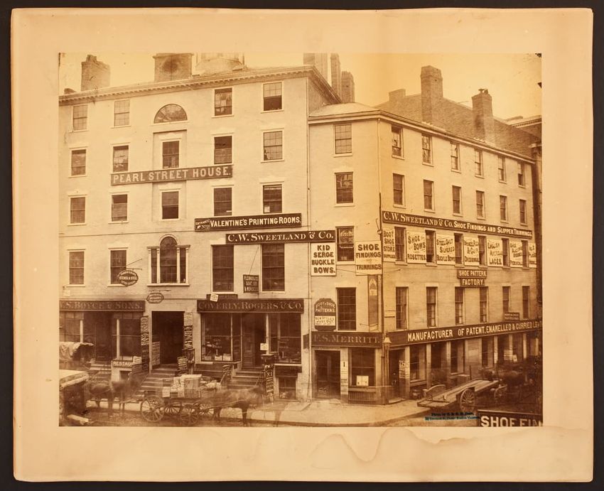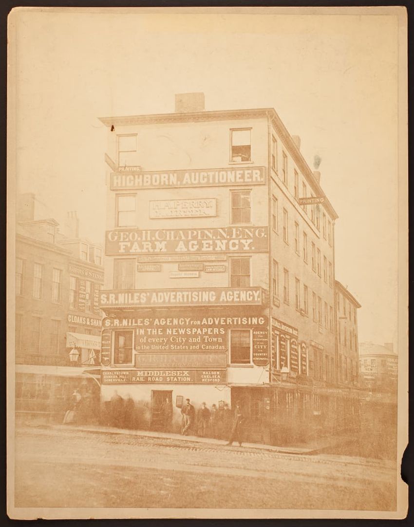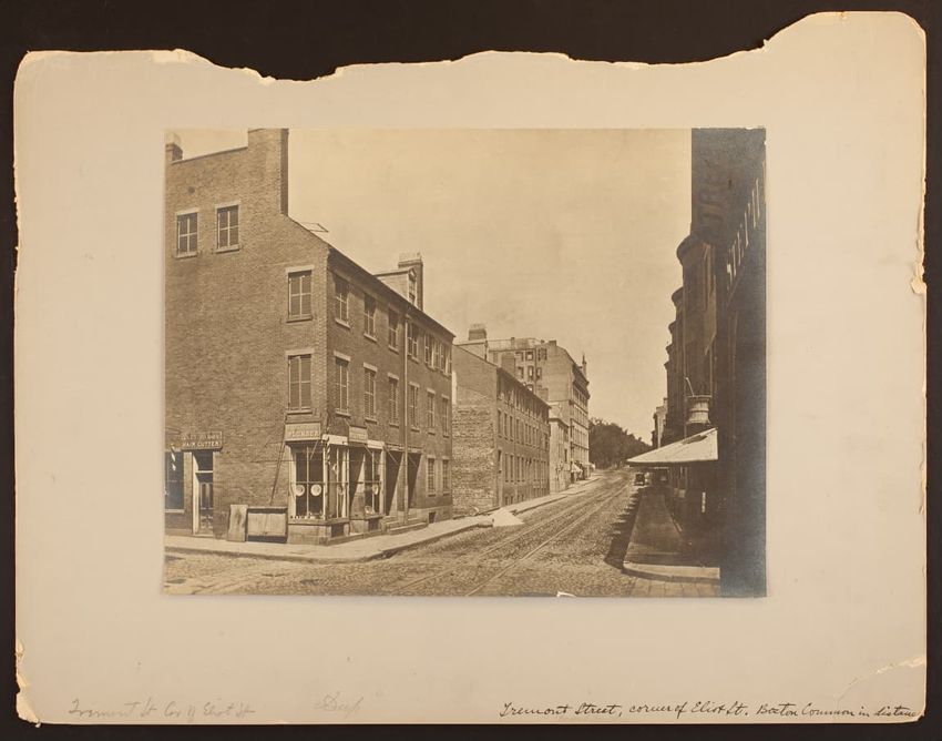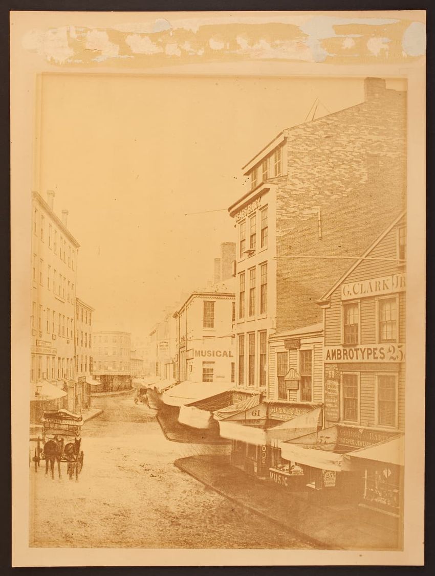 Exterior view of commercial buildings and storefronts between 187 and 195 Massachusetts Avenue, including the Window Box Cafe, the Fenway Barber Shop, The Melody Shop, a shoe and hat repair shop, and a locksmiths/hardware store. Streetcar tracks are in the foreground.