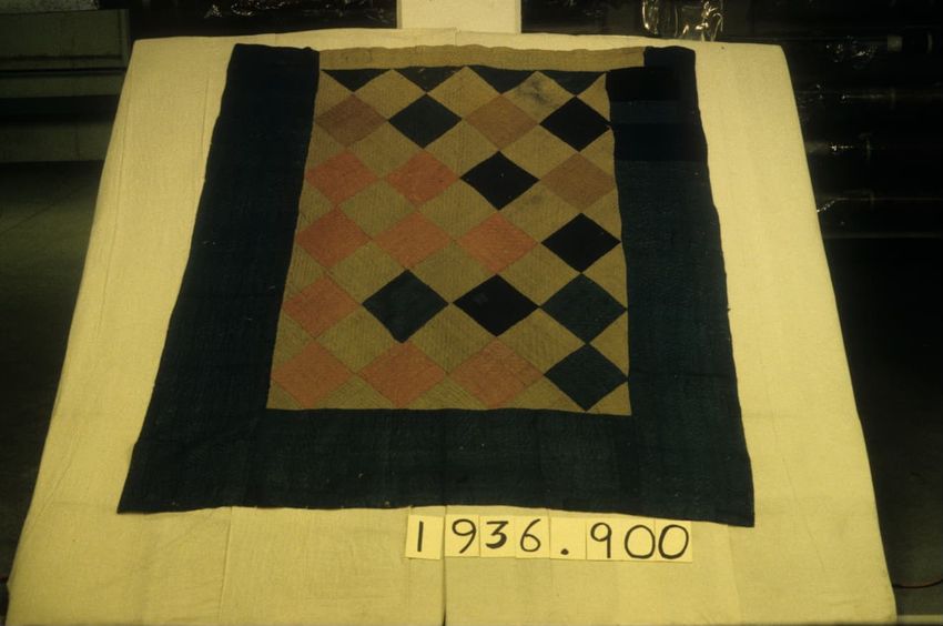 Central panel pieced wool glazed and unglazed, plain and twill weave diamonds of alternating blue, green, red and tan. Narrow green wool side borders; wide blue glazed wool head and foot border. Quilted in zig-zag pattern in head and foot border. Straight lines in central panel.