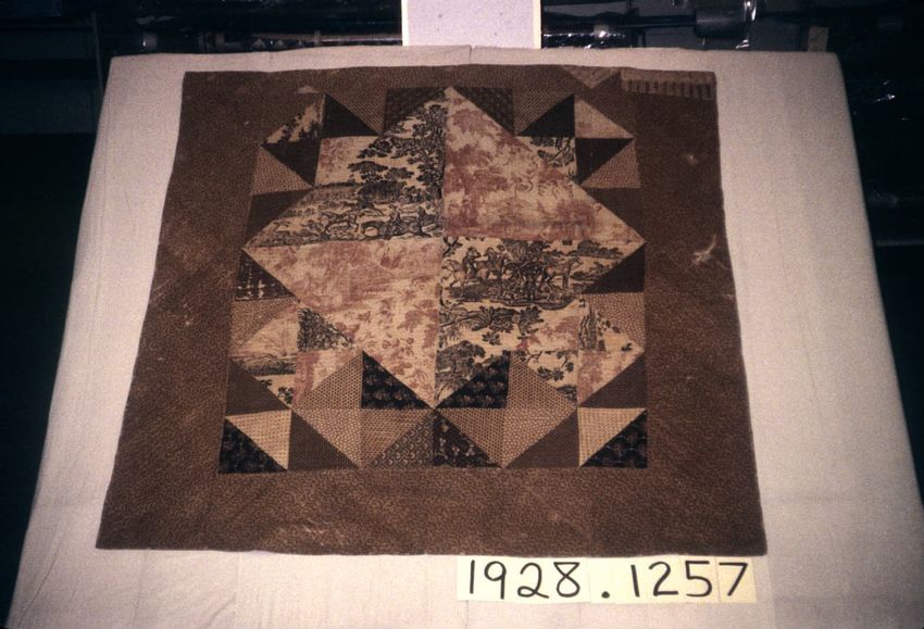 Central block large diamond, quarterly divided by brown and white hunting scenes and red and white pastoral scenes. Remainder of block pieced brown and white, and red and white floral block prints and floral designs. Border of block printed stripes of brown; brown crescents all over. Bound edges; ch...