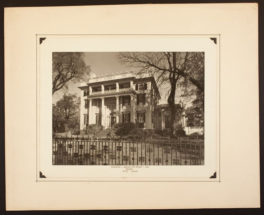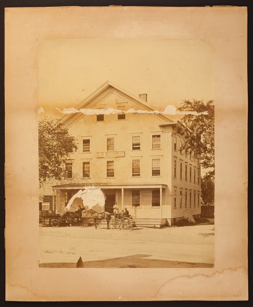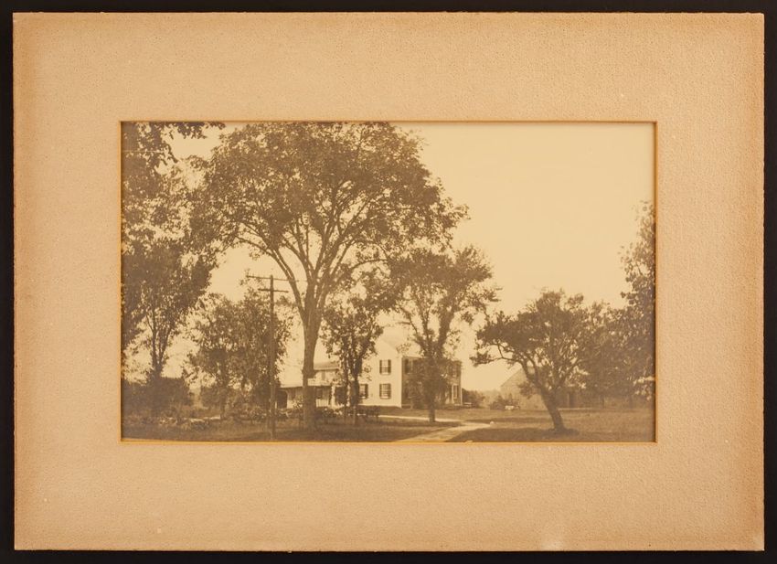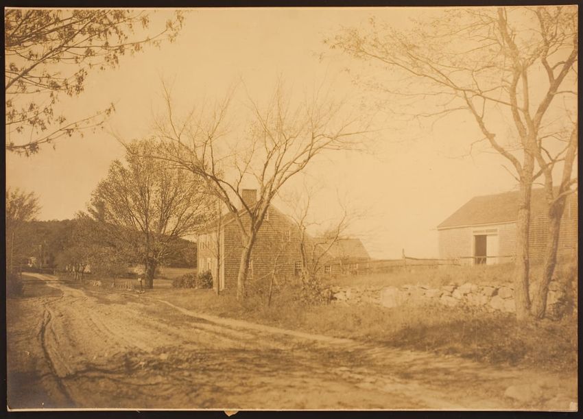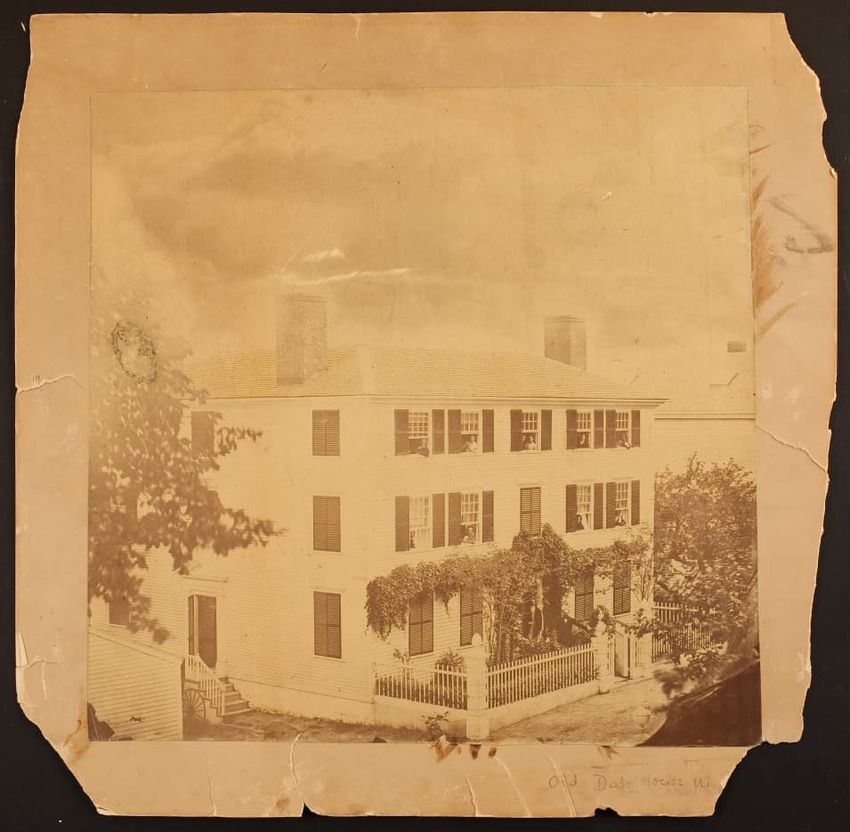 Oblique exterior view of the Jennes ("Old Sheriden") House, Rye Beach, N.H., with men, women, and children seated in front of the entrance, probably members of the Jenness family.