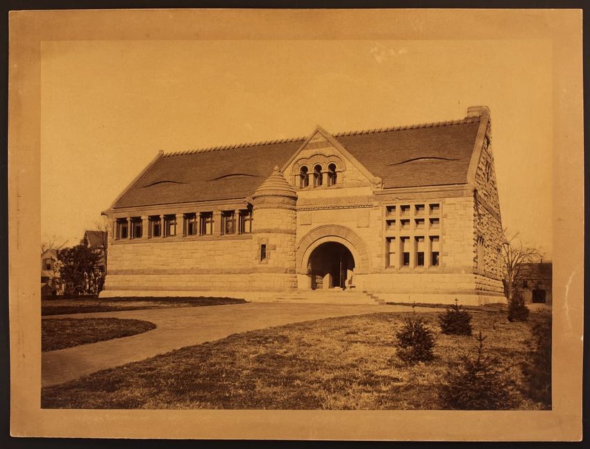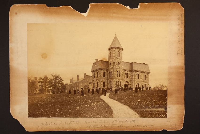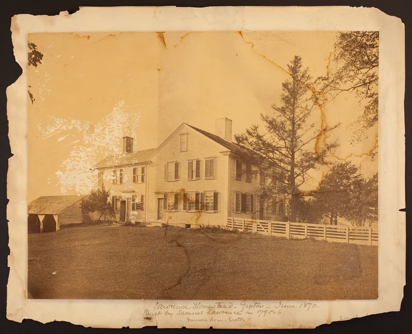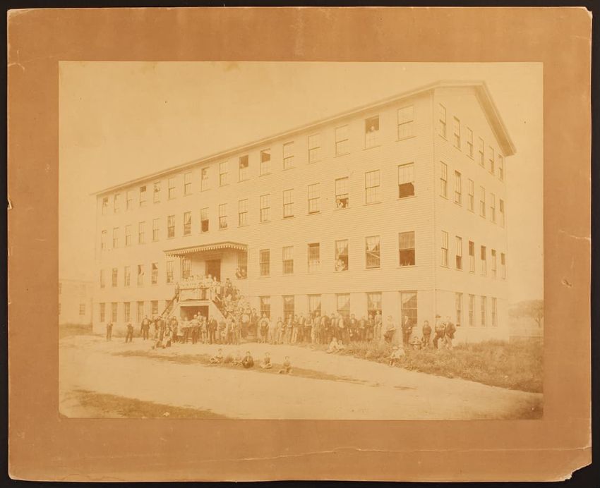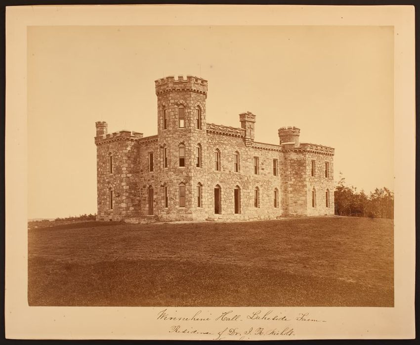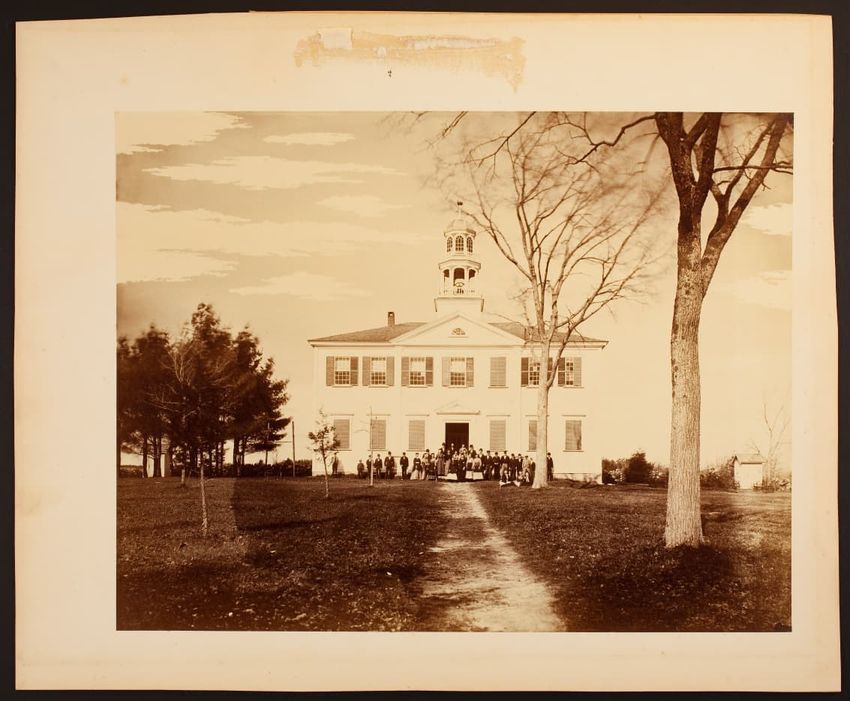 Oblique exterior view of the Jennes ("Old Sheriden") House, Rye Beach, N.H., with men, women, and children seated in front of the entrance, probably members of the Jenness family.