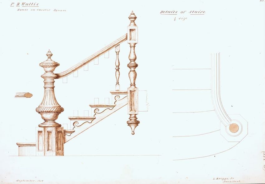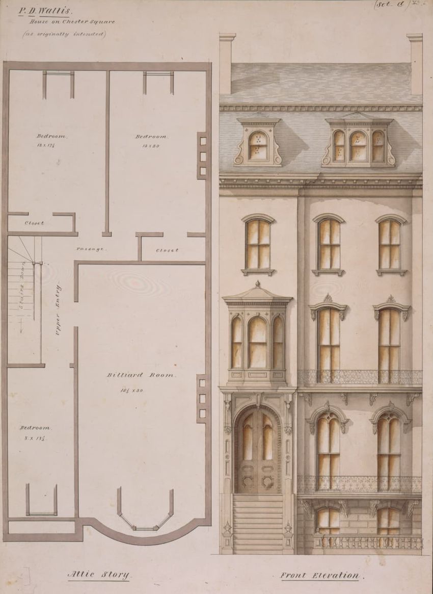 Architect Luther Briggs, Jr. designed this four-story row house in Chester Square in the South End of Boston, Massachusetts, in the Second Empire style. The ink and wash drawing presents a floor plan of the attic and a front elevation, with wrought iron railings on the first and second story balconi...