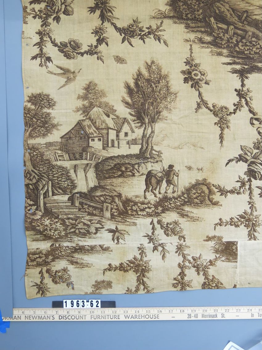 copper engraving (printing process), cotton (textile), fringe, hand weaving, linen (material), machine sewing (technique), net (textile), piecing, tabby (textile), alteration (process and technique), toile (textile material)