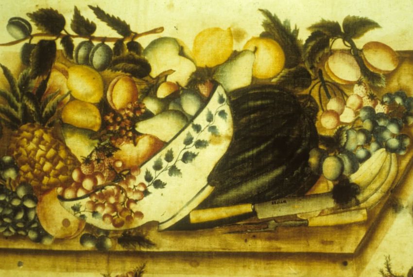 Loose, plain weave; applied 3" wide netted fringe; hanging bellflower strings. Large scale scenes: family along road walking past pairs of livestock and two men, one playing a flute. In background parkland with deer, castle/church and manor house. Tree border printed in blue and white ground. B) Pan...