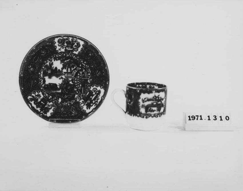 A) Cups with white clay body and glaze; cylindrical deep bowl with shallow foot ring; applied simple C-shaped handle; underglaze deep blue decoration of diapered band with superimposed flowers, broken by cartouche shaped reserves with flower arrangement on a stand. B) Conforming circular shallow sau...