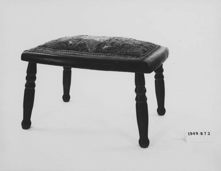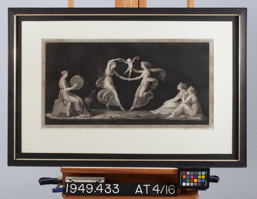 Gilded domed foot with rounded stem supports rectangular pierced, leafy, scrolled frame; encloses white porcelain lithophane. Scene shows figures gathered around large domed basket (?) trying to capture putti. At center n man holds a putti by wings. Above basket, sprawled putti flies with string tie...