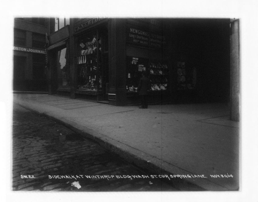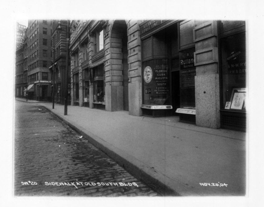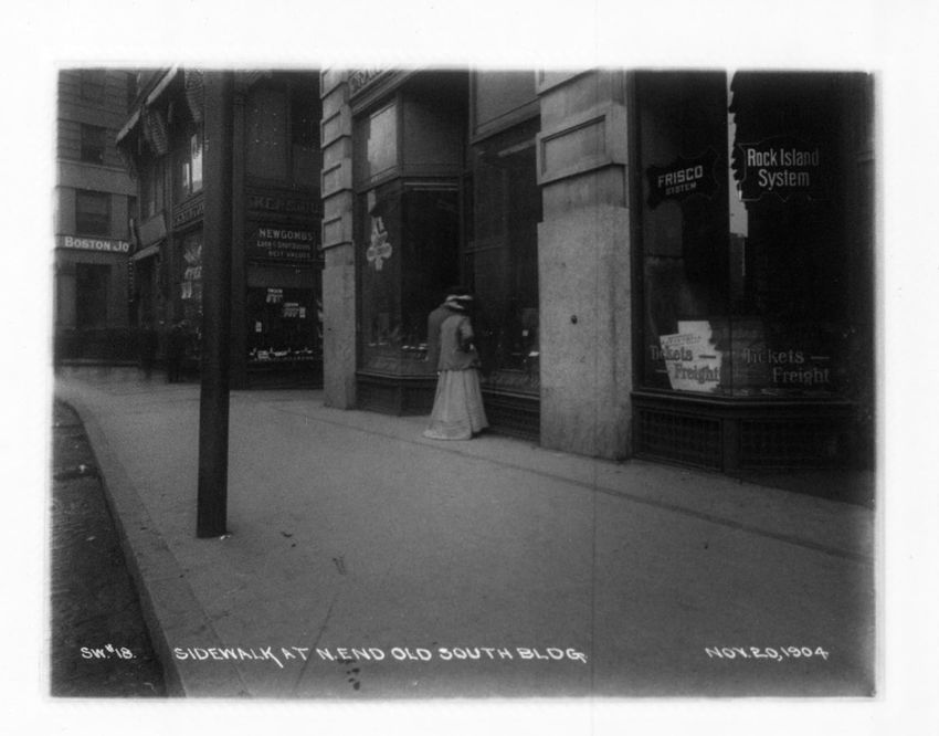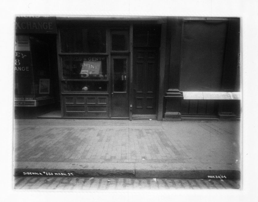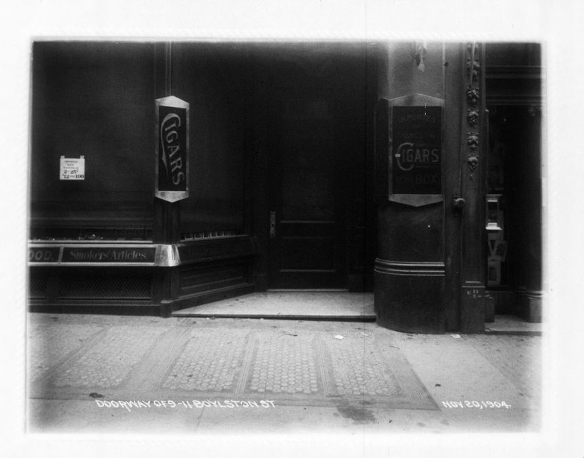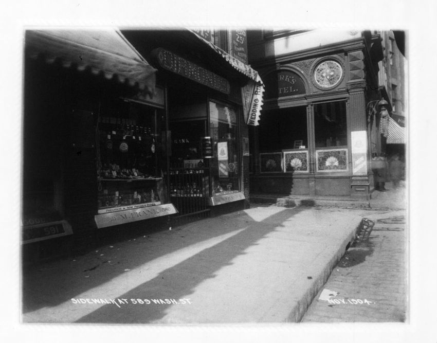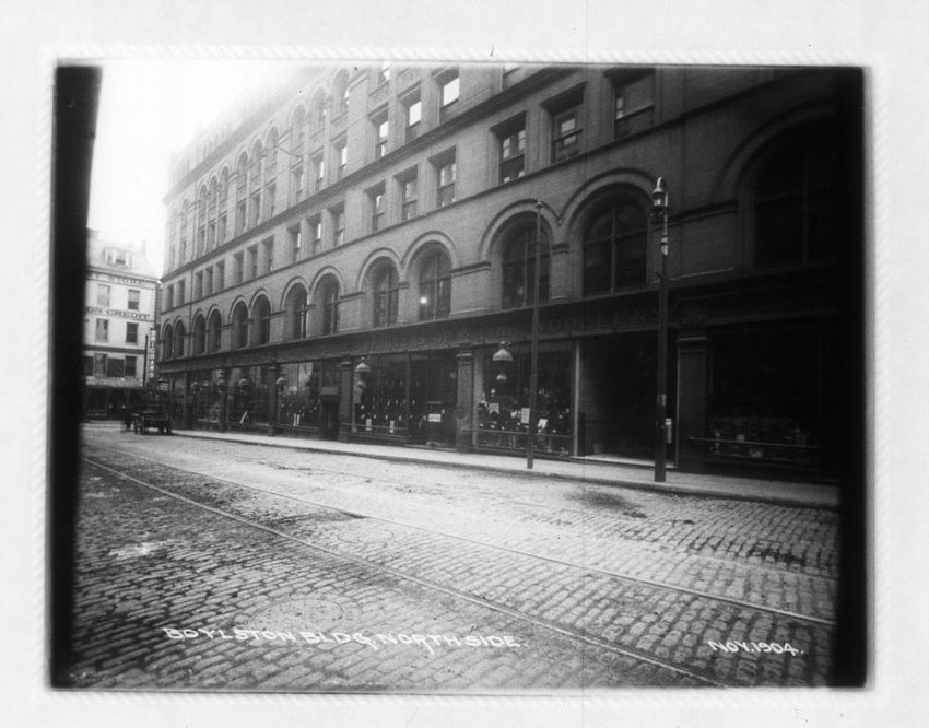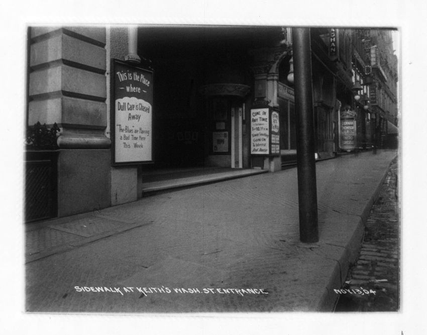 The sign in the doorway reads "The Arcade, entrance to Marston's Luncheon for Men and Women." Across the street part of the Adams House hotel can be seen next to the entrance to B.F. Keith's New Theatre. To the right of the theatre is O'Callaghan, a cloak and suit store.