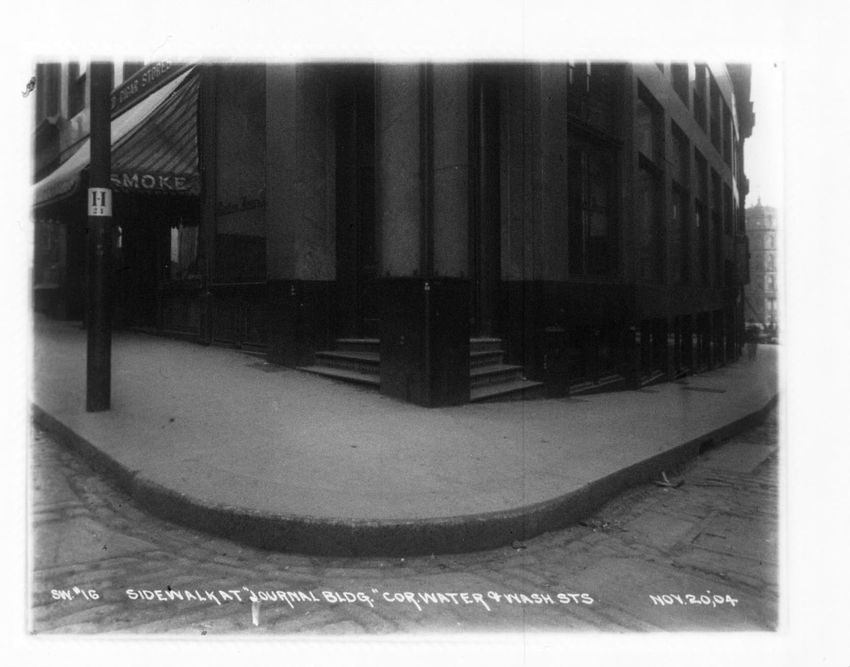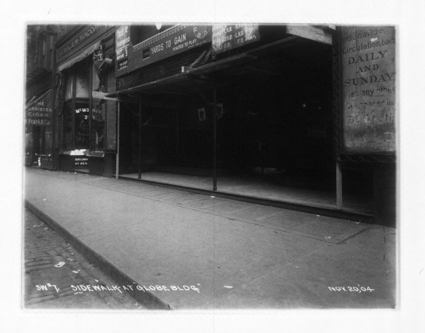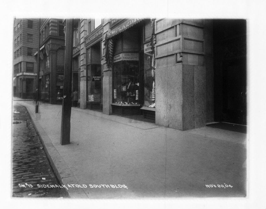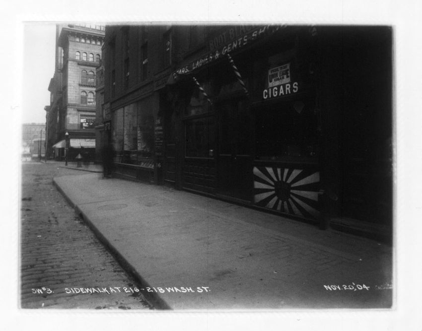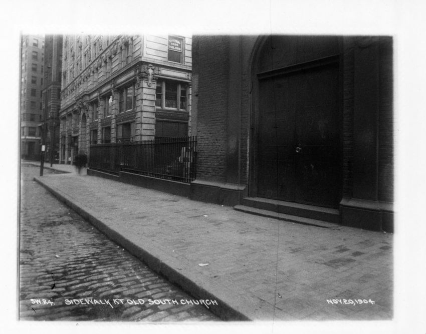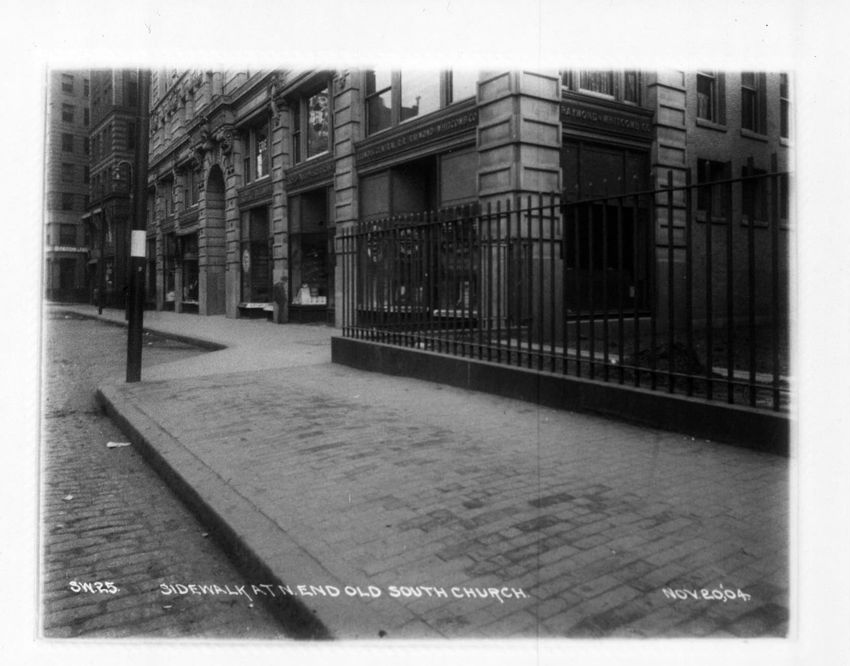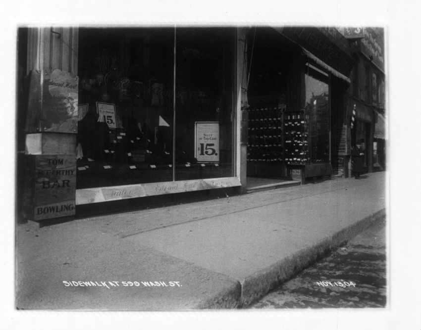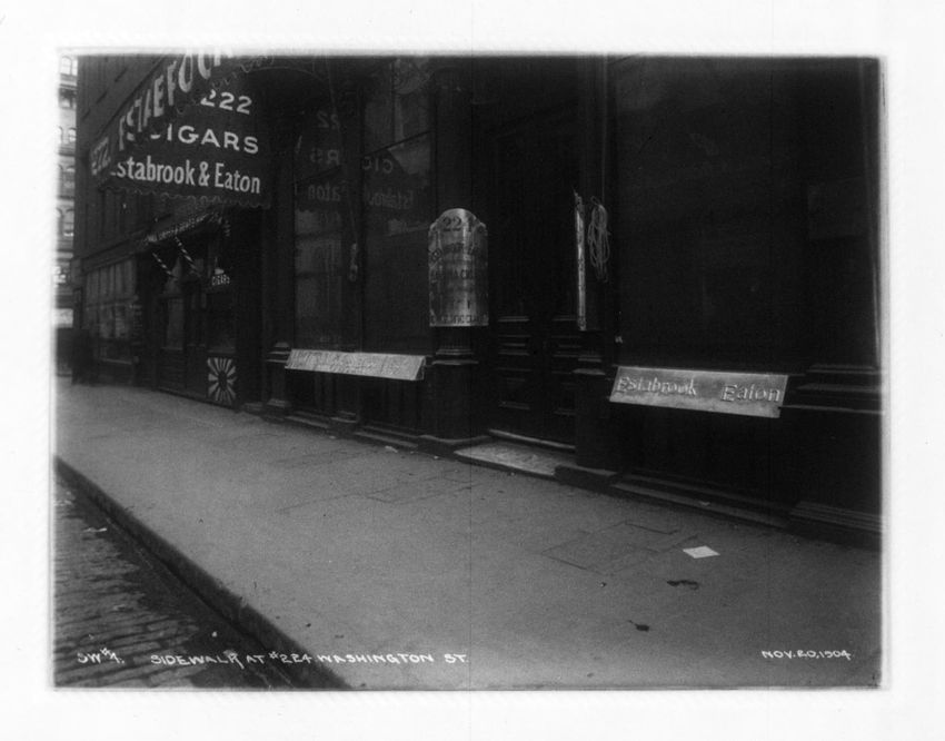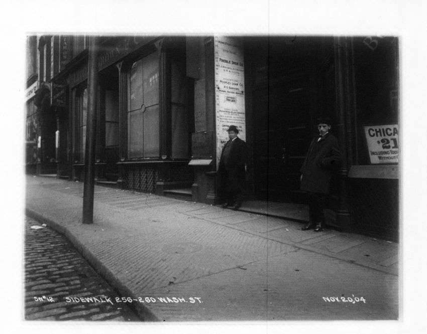 The sign in the doorway reads "The Arcade, entrance to Marston's Luncheon for Men and Women." Across the street part of the Adams House hotel can be seen next to the entrance to B.F. Keith's New Theatre. To the right of the theatre is O'Callaghan, a cloak and suit store.