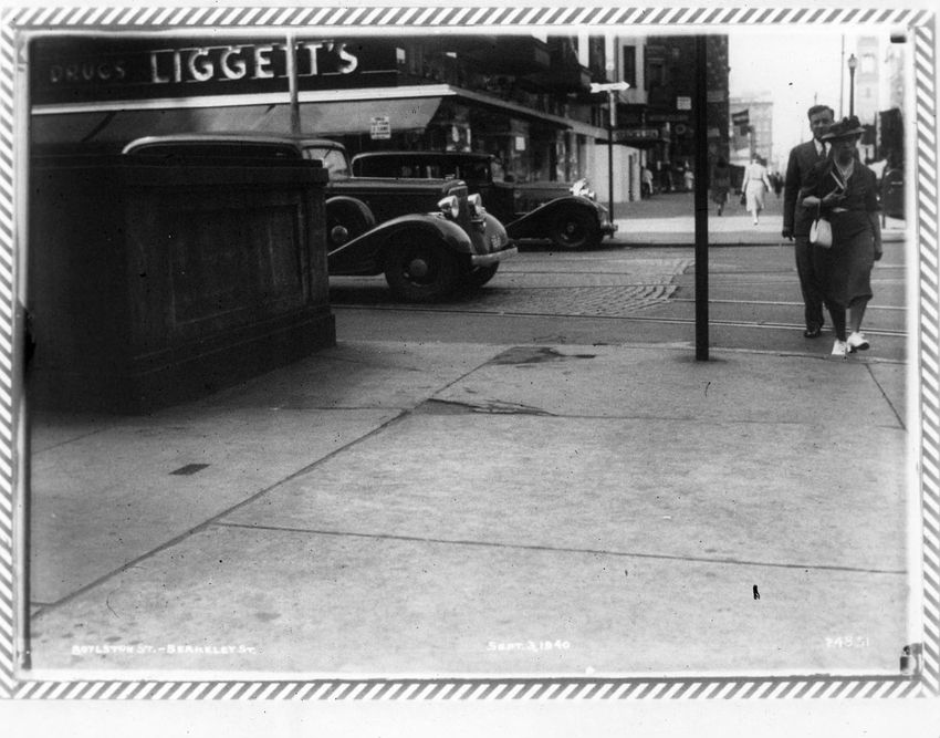 The Berkeley Street entrance to the Arlington Street Station is on the left of the image. Liggett's drugstore can be seen on the corner.