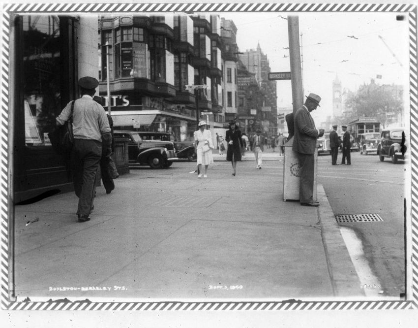 Pedestrians, automobiles and a streetcar are seen at the intersection of Berkeley and Boylston Streets.