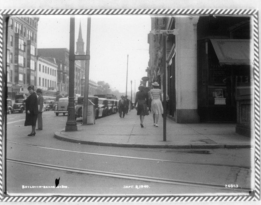 A sign for Steele, Litvin Furs can be seen on the right side of the image. Jones, McDuffee & Stratton is on the left side of the image. Arlington Street Church can be seen at the Arlington and Boylston Street intersection.