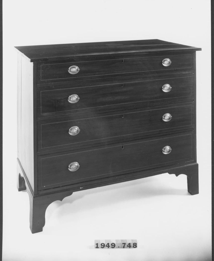 Rectangular; resting on straight bracket feet. Four graduated drawers with incised lines following contour of drawer front. Corresponding blond stringing. Rectangular top with straight edges.