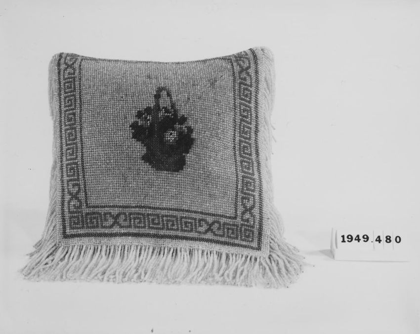Square yellow silk pillow covered with cotton knit needlework and beadwork; white ground with basket of flowers enclosed by blue Greek key border. Long white bead fringe.