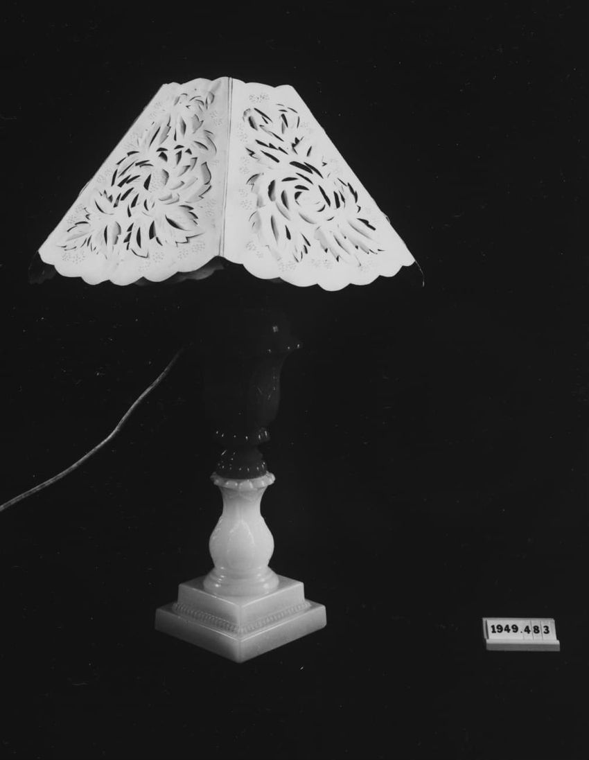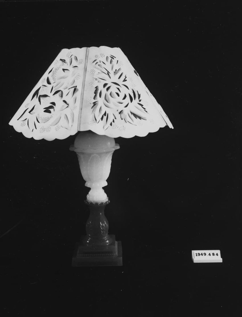 Opaque white square base; central beaded molding. Vasiform waisted stem; molded acanthus leaf decoration. Opaque white font; beaded and faceted neck; tulip-shaped body with scalloped border enclosing domed top; brass collar. Font applied to base with white blown wafer. Fitted for electricity; cutwor...