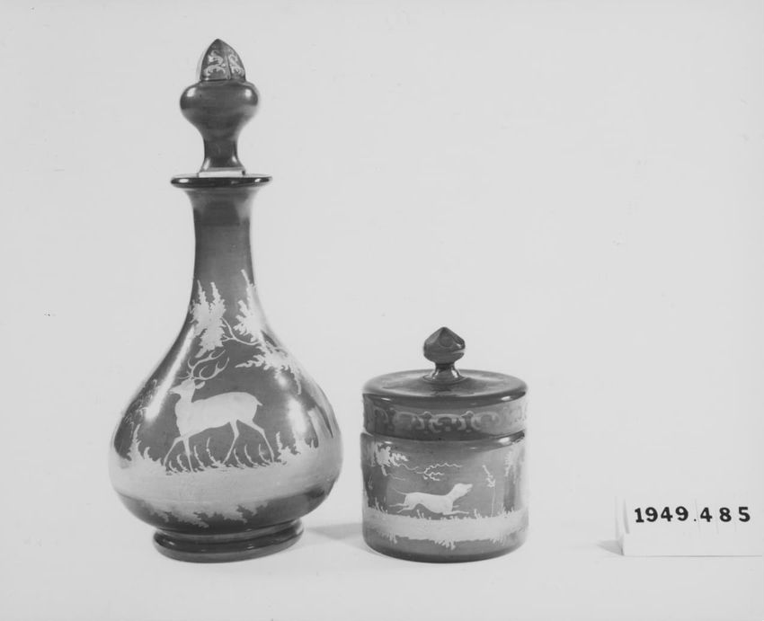 Royal blue flashing over colorless body; wheel-cut scene of forest and deer. Circular bulbous body on squat circular foot. Globular stopper; six panel domed knop with scroll motif.