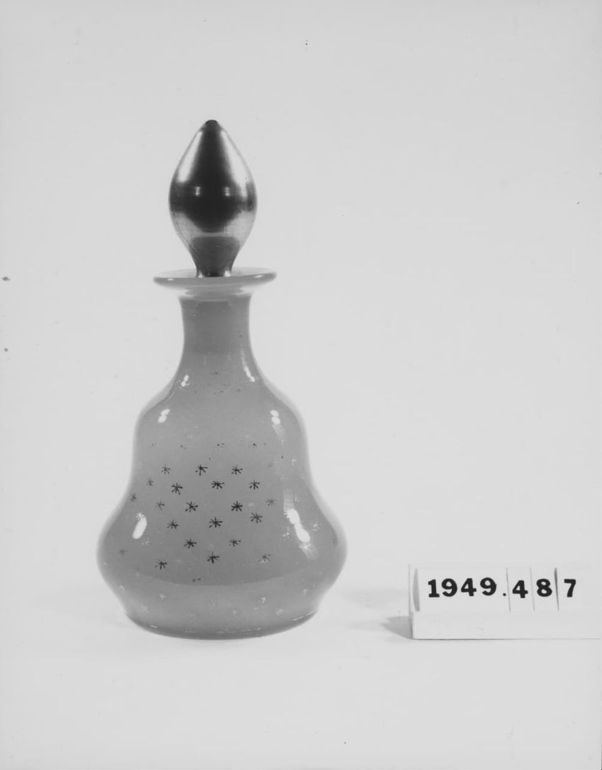 Bottle: cerulean blue opaque body. Globular; tapering upward from flat bottom to small cylindrical neck with flaring mouth. Polished pontil. Tiny gilt stars overall. Stopper: clear, teardrop finial stopper. Gilt; cylindrical stem.