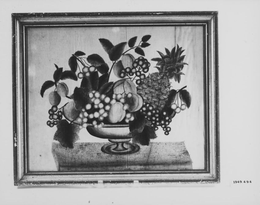Stylized fruit in blue bowl stenciled and painted on white velvet. Bowl stands on brownish-orange table top. Molded wood frame with gilt gesso applied to front, sides unfinished.
