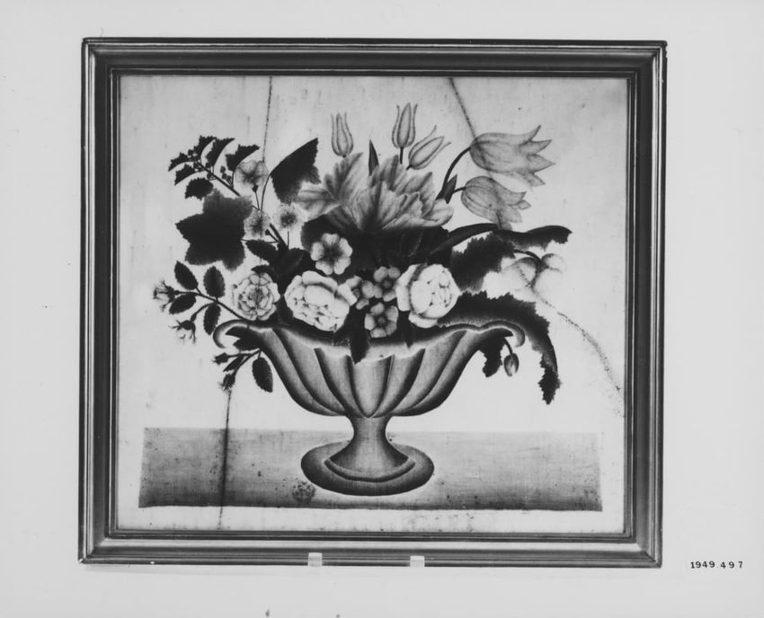 Stylized flowers in blue bowl stenciled and painted on white velvet. Bowl stands on brownish-orange table top. Mounted under glass. Molded wood frame with gilt gesso.
