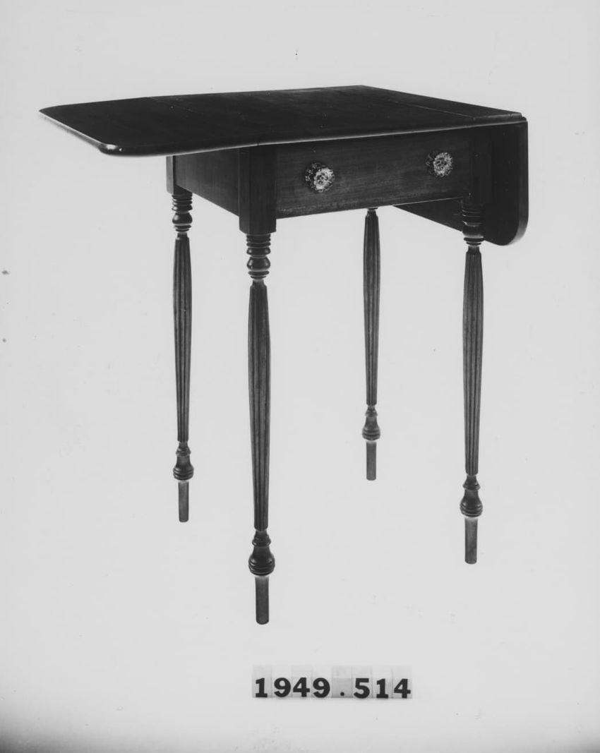 Square top with two drop leaves; rounded corners. Case encloses leaf support slides and single frontal drawer; two molded brass rosette pulls. Turned and reeded legs; cylindrical foot. Brass pulls probably later additions.