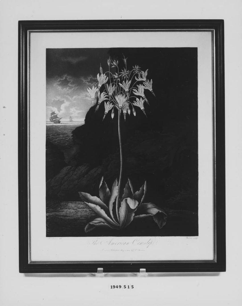 Single stemmed flower has leaves at ground, plain stem with white blossoms and buds. Rocky background with opening at left revealing ocean with two sailing ships. Molded wood frame, painted black; gold-painted inner edge.