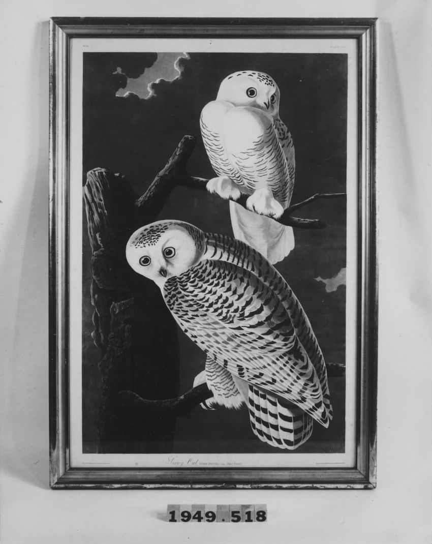 Engraving of two snowy owls on a blasted or dead tree trunk. Hand colored. Molded wooden frame with gilded gesso.