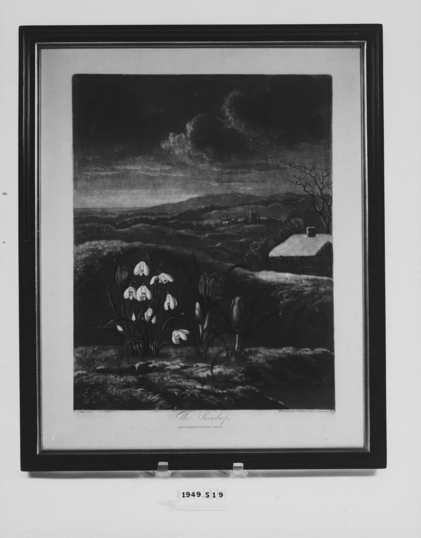Depicts flowers in foreground with landscape background. Landscape and house covered with snow.
