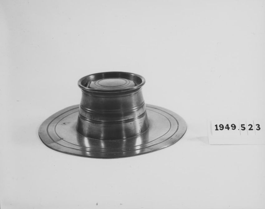 Circular with two incised rings. Well: cylindrical, tapering at top, with incised rings. Flaring lip. White ceramic ink well fits inside pewter container. Pewter hinged lid; five holes for pens.