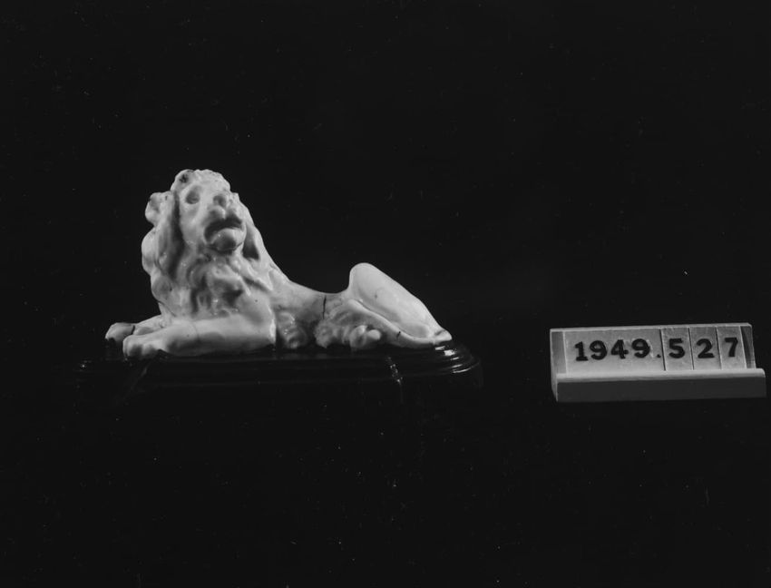 White body; transparent glaze. Realistically modeled figure of reclining lion. Cartouche- shaped, stepped base with rounded ends, painted royal blue in overglaze enamel.
