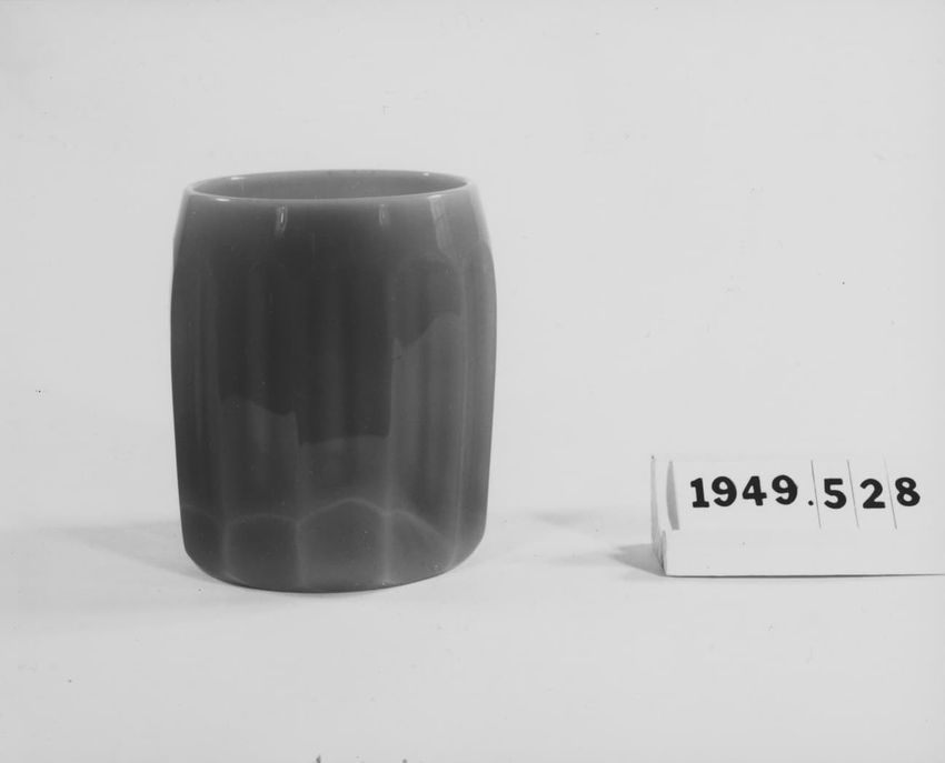 Opalescent cerulean blue body. Cylindrical form; vertical facetted ribbing overall, tapering inward at circular mouth. Flat bottom with pressed sunburst or sunflower design.