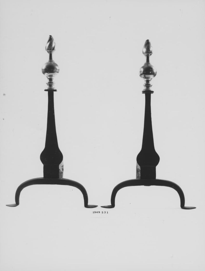 "Knife-blade andirons". Flame-shaped shaft, ball-shaped finial with incised lines, turned and incised pedestal. Finial rests on square, flat wrought iron platform. Cabriole legs and flat slipper feet. Rectangular billet bar riveted to plinth.
