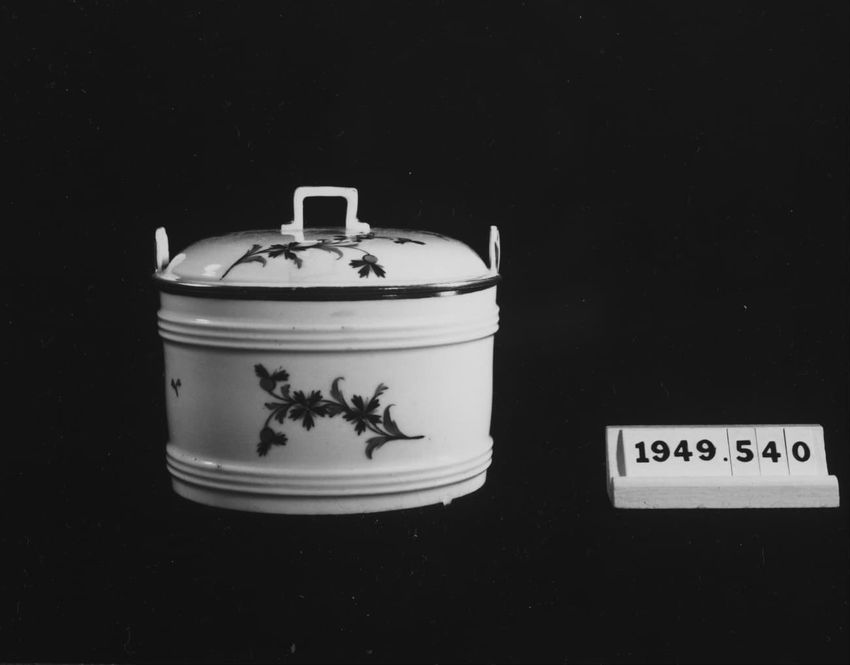 Box: white body with transparent glaze. Circular tub-shaped with "strapping" at top and bottom. Cover: shaped ear handles meant to receive rope or bail handle. Applied finial handle. Overglaze enameled sprig decoration of cornflower-like flowers.