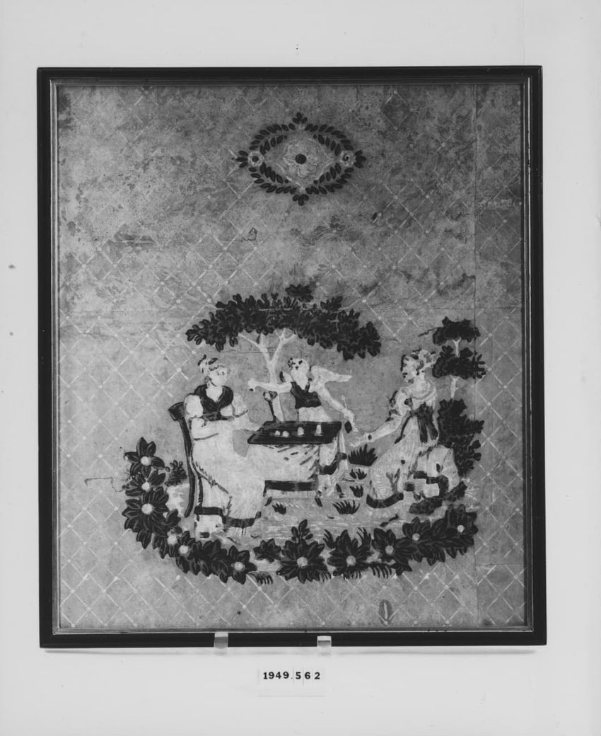 Black painted, molded wood frame; gold painted inner edge. Under glass. Pieced wallpaper fragment has light blue ground with white diamond pattern; three figures seated around table. Tree in background with green flowers at base. Above green leafy quatrefoil motif.
