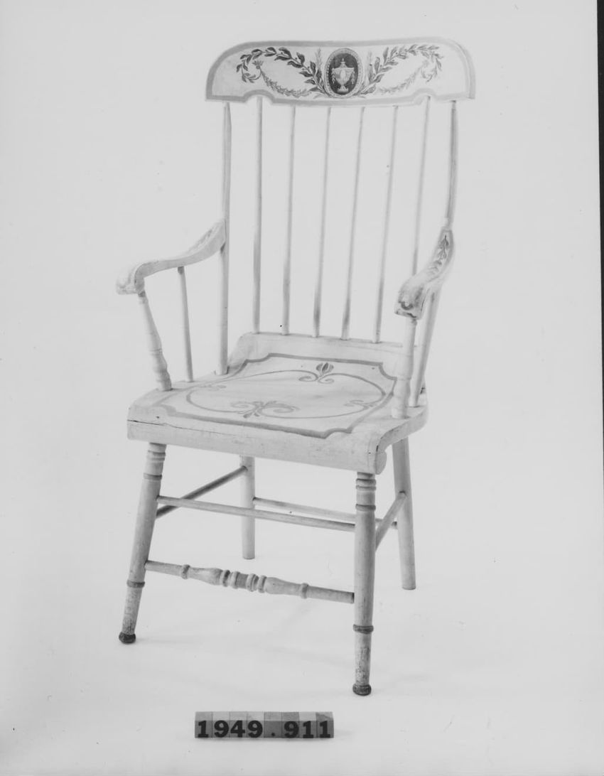 White-painted, high-backed in Boston rocker style. Yoke crest supported by round stiles and tapered spindles. Light blue linear highlights. Seat has scrolled quatrefoil with fleur-de-lis at center front. Classical motif on crest of ovoid recess with urn at center.