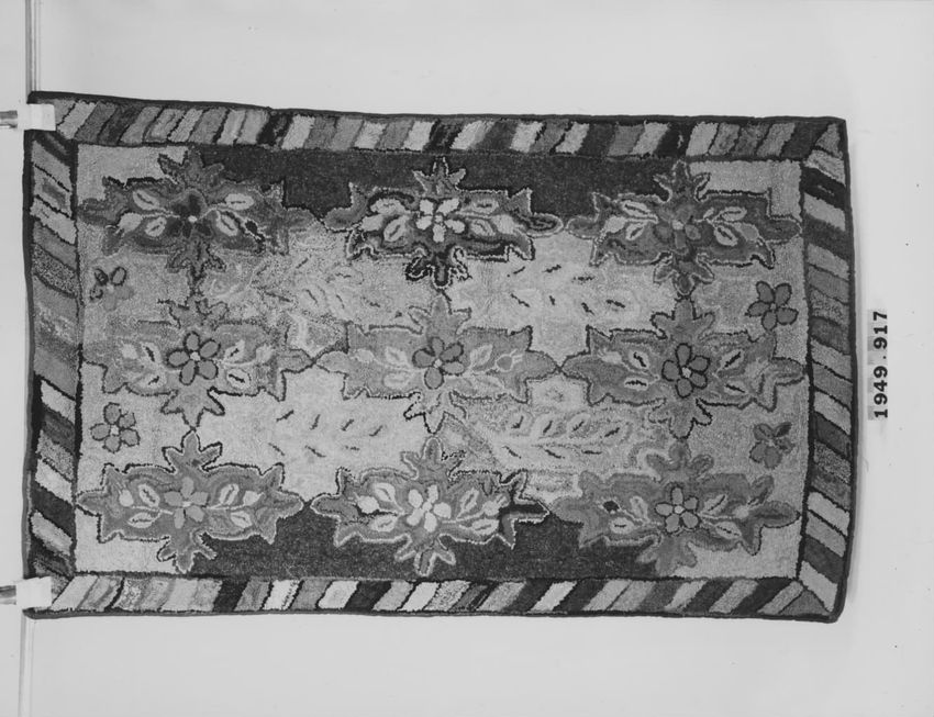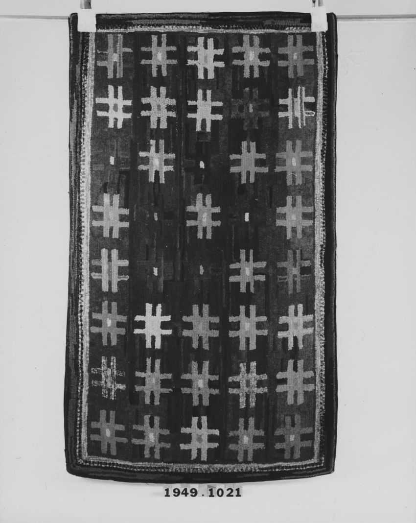 Rectangular with multicolored "tic-tac-toe" design on blue field. Bound with black cotton twill.