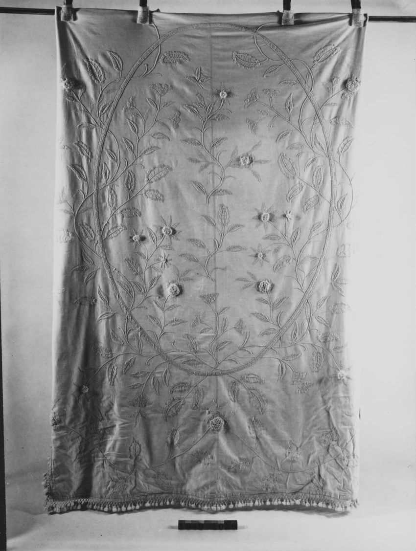 White-on-white; white fringed edges on sides and bottom. Bottom corners cut for footposts. Central motif: oval with scrolled leafy vines ending in flowers with raised center. Top end, undecorated. Lined with white cotton.