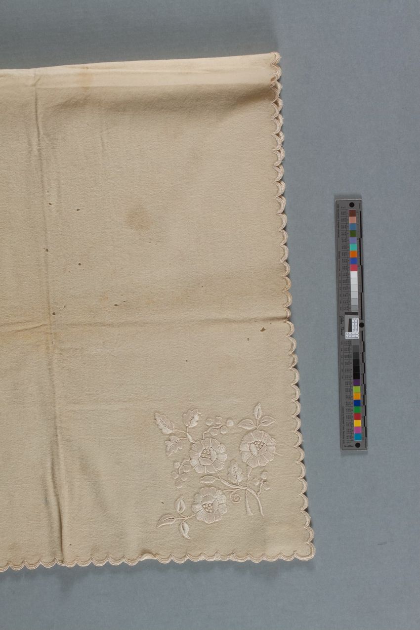 Nearly square, off-white, fine weight, plain weave wool with scalloped edges. Bound in cream-colored silk with same embroidered floral sprays in two opposite corners.