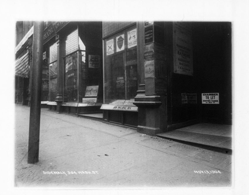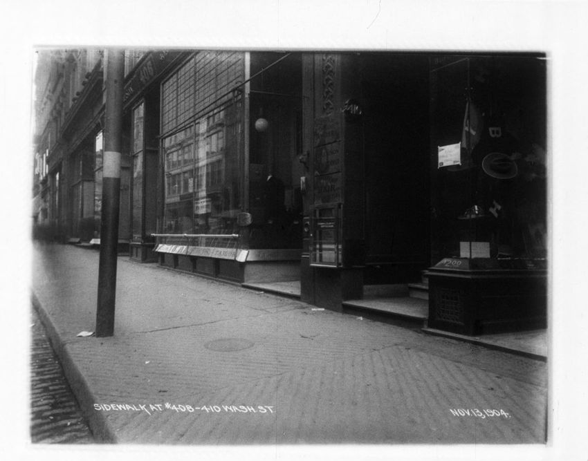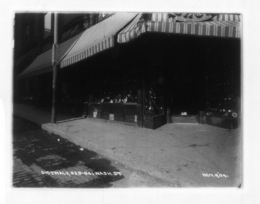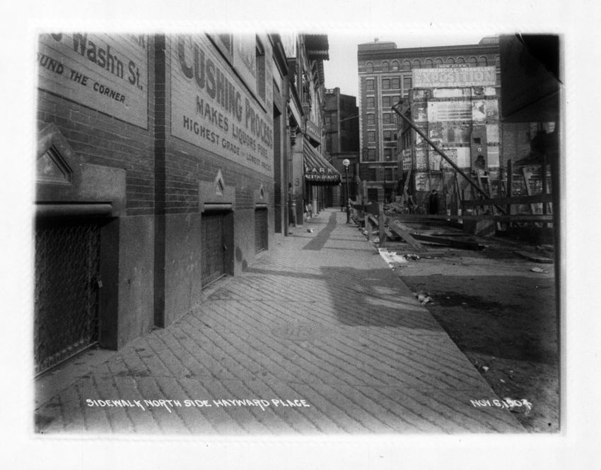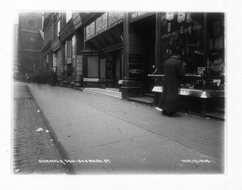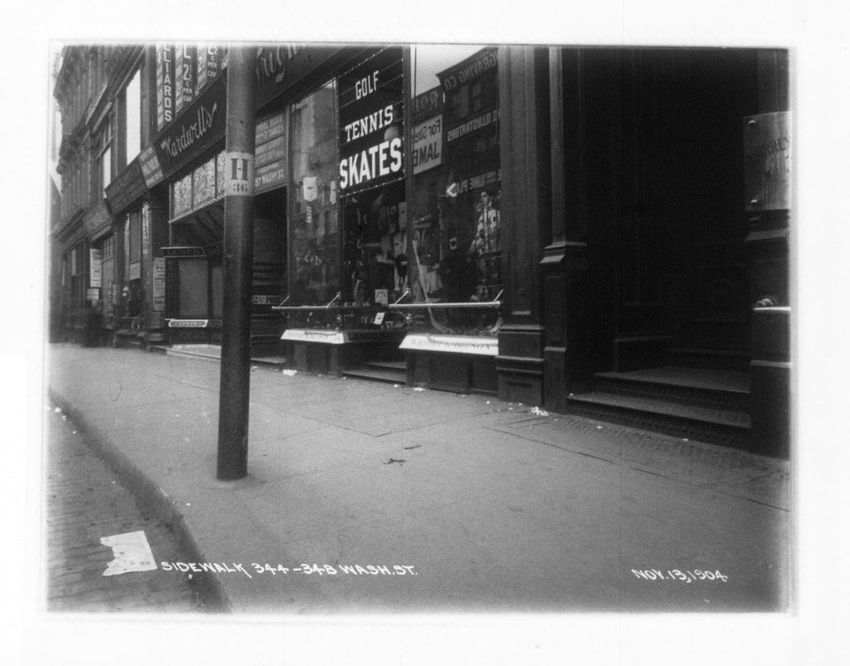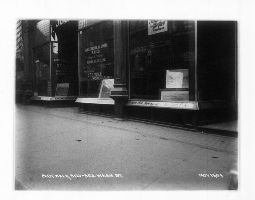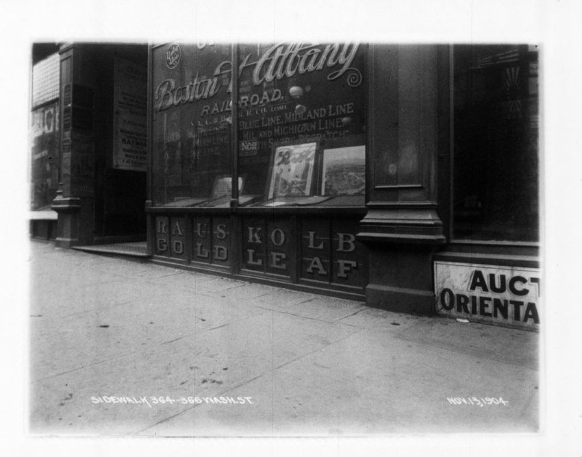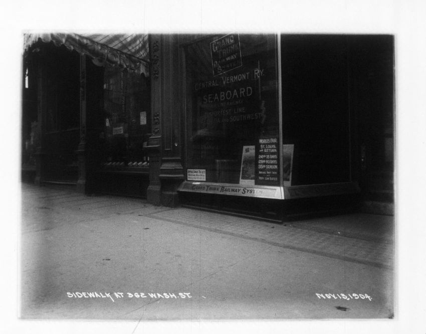 The Old South Meeting House can be seen on the upper left side of the image at the intersection of Milk and Washington Streets. The businesses on the right side of the image are the Boston Transcript, the Santa Fe Railroad ticket office and the Hobbs & Warren stationery shop. Wardell's restaurant, a...